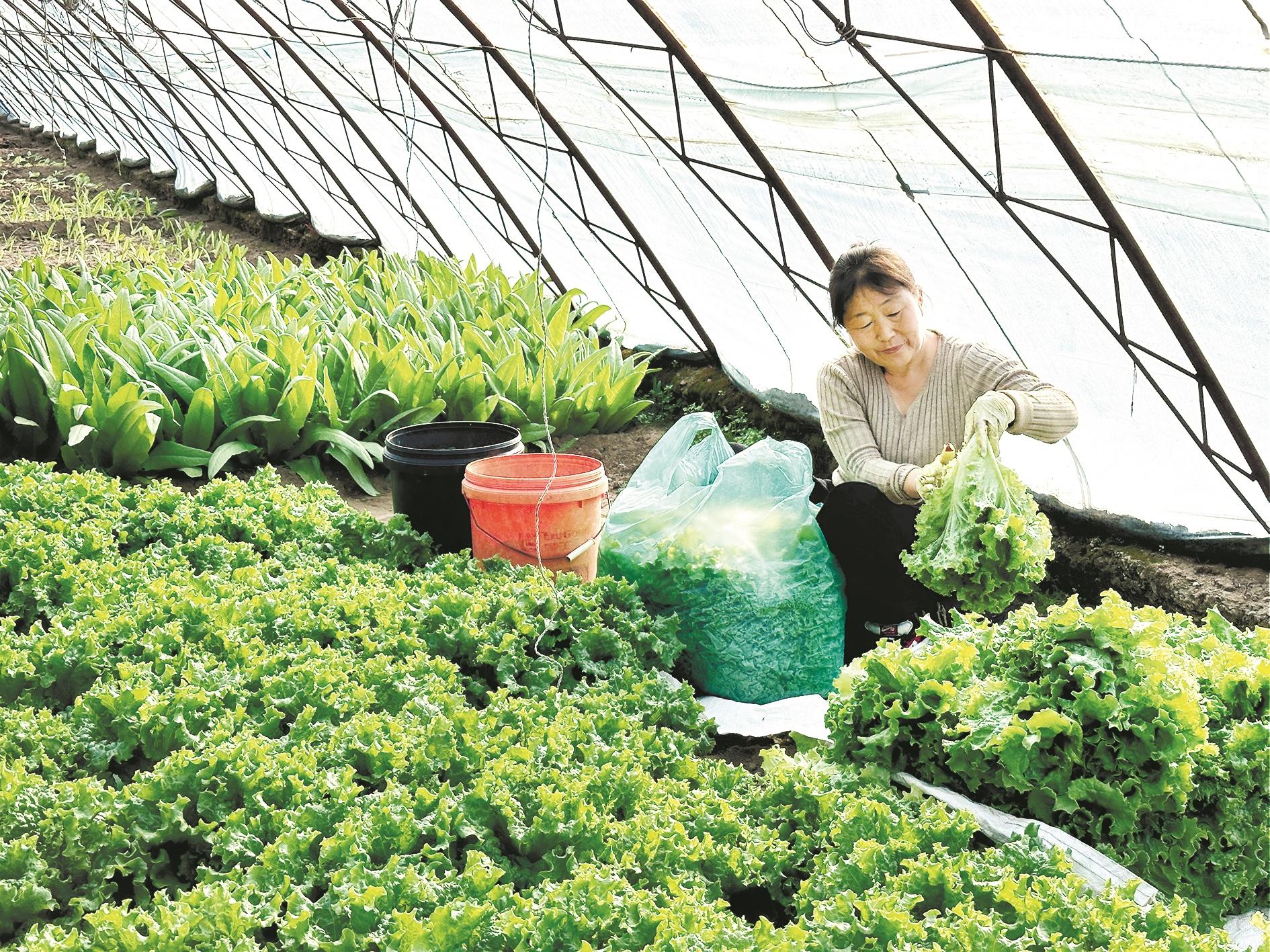 据市农牧局发布的今年全市前三季度经济运行数据显示,1至9月,我市蔬菜种植面积1.06万亩,同比增长5.2%;产量2.97万吨,同比增长7.2%,呈现双增长态势。图为海勃湾区千里山镇团结新村的种植户在蔬菜大棚采摘蔬菜。(王蒙 摄)