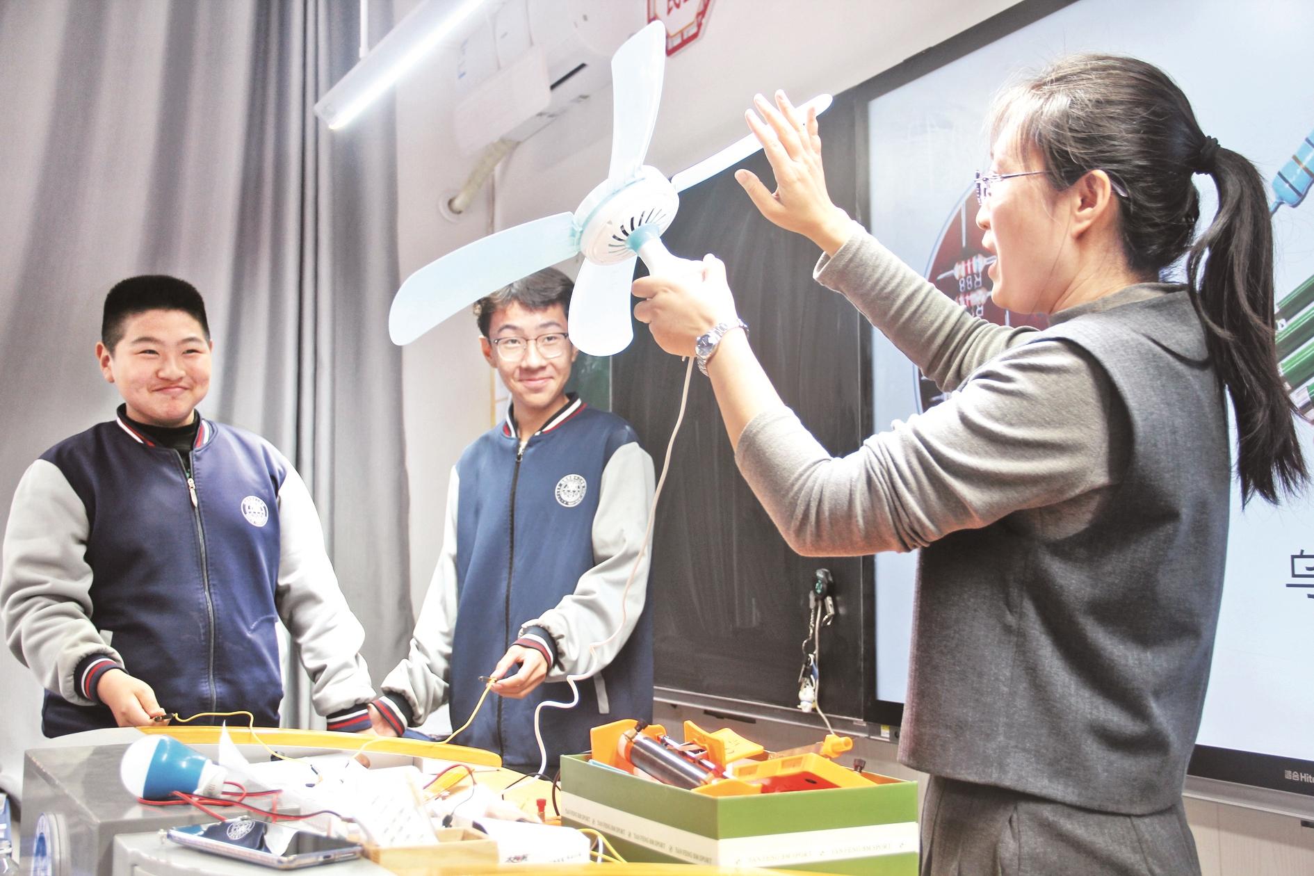 “同学们,之前学习风力发电可以点亮小灯泡,大家提出如果是把风扇插头的两端拿到手上会不会有被电的感觉呢?今天就让大家来体验一下,谁想来?”课堂上,市第十二中学物理教师庞敏提出疑问。