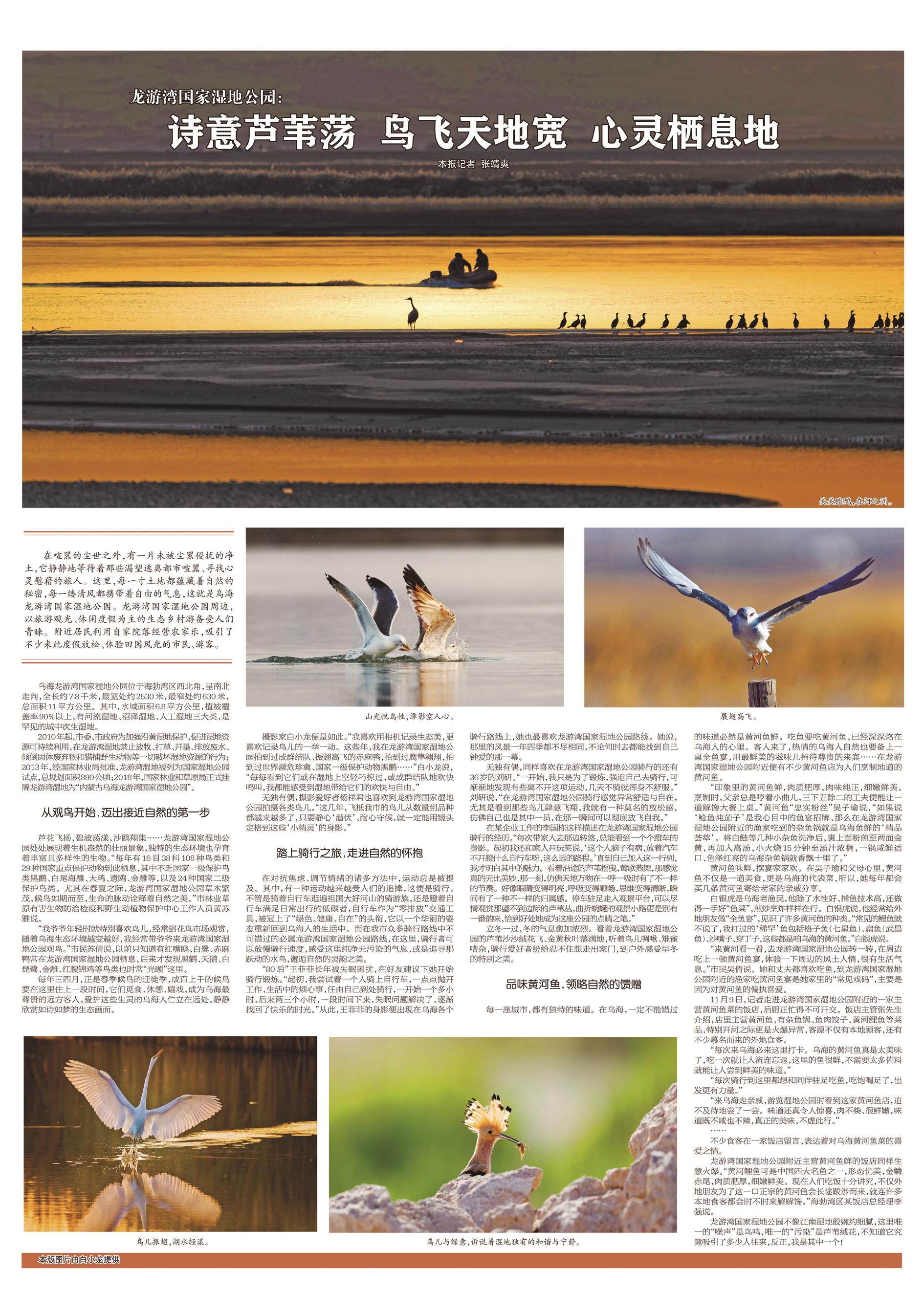 这里,是城市喧嚣中的一片净土,不论春夏,还是秋冬,每一个季节都会演绎出如诗如梦的生态画卷——这就是经过乌海人十多年开发建设的龙游湾国家湿地公园。 详见六版