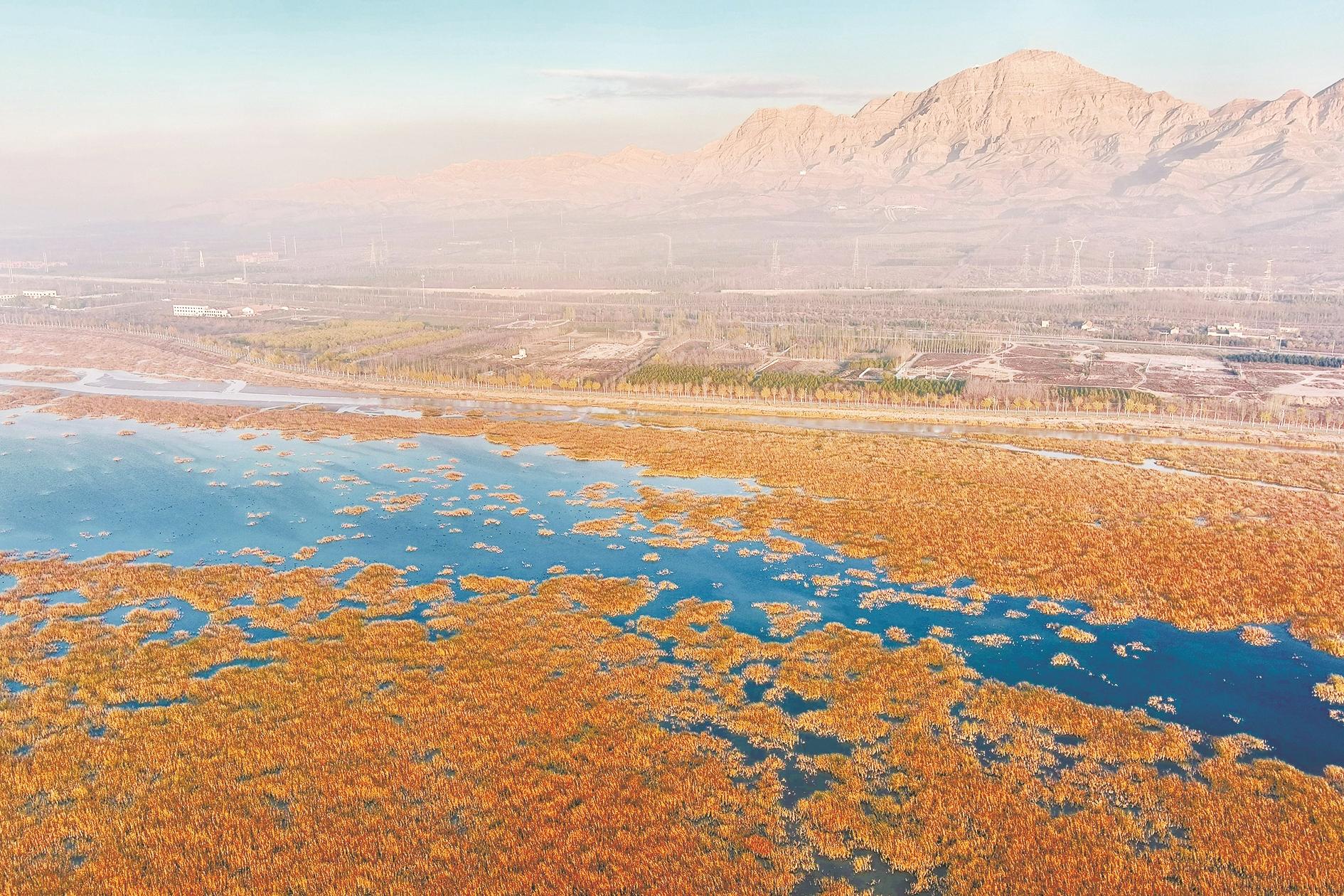 初冬时节,黄河岸畔景色宜人,山水交相辉映,浅滩中金色芦苇迎风摇曳,绘就了一幅动人的自然画卷。 (王超 摄)