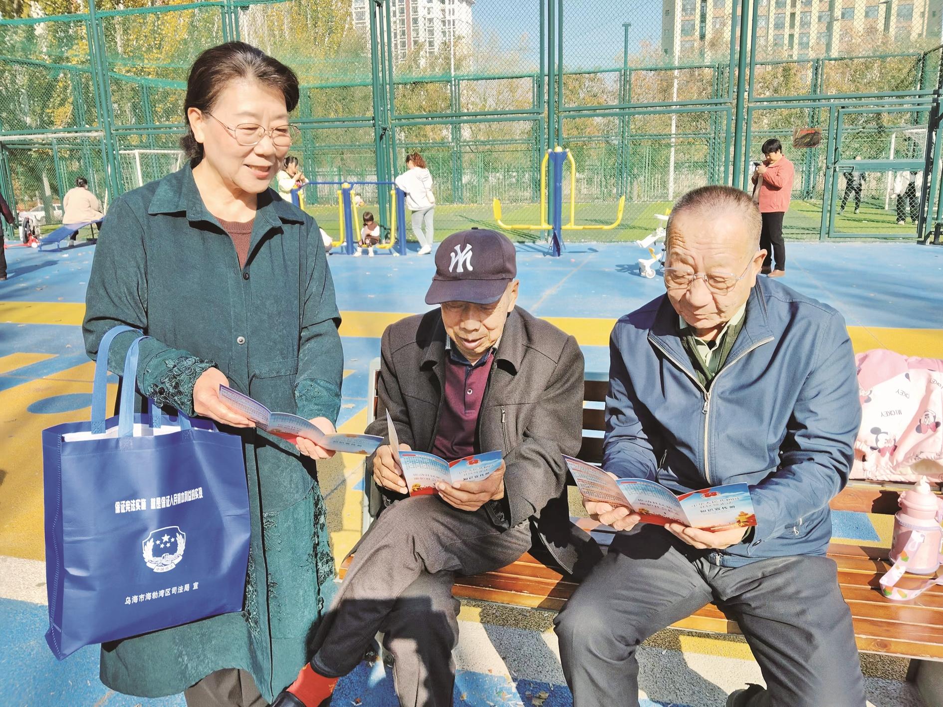 近日,海勃湾区林荫街道关工委开展“中华民族一家亲,同心共祝祖国好”宣讲活动。活动现场,宣讲员向居民讲述了历史上感人的民族团结故事和我市各族人民团结奋斗的感人事迹,并向居民发放了民族团结宣传资料。 (李浩 摄)