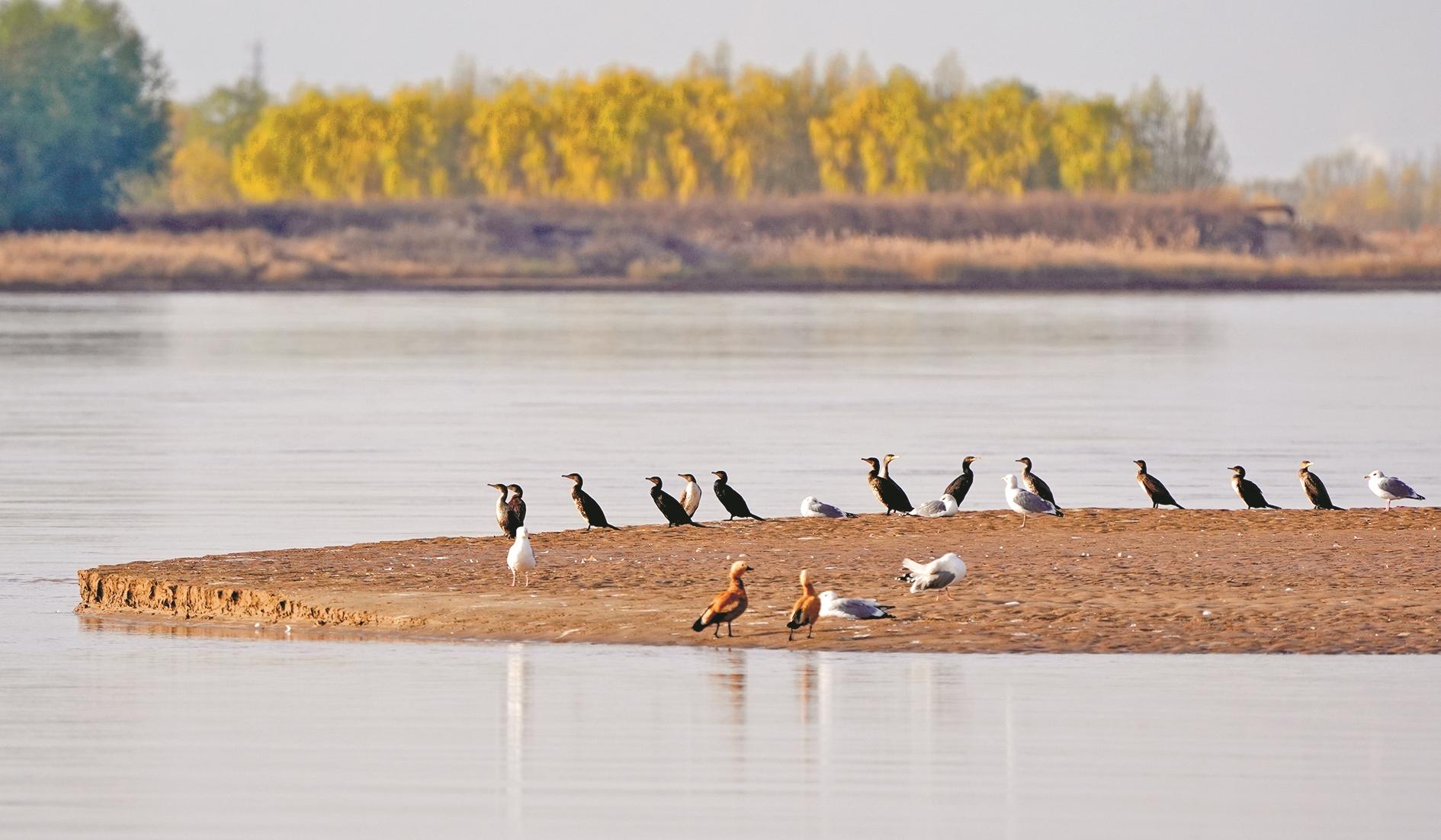 11月16日,候鸟在黄河宁夏段驻足栖息。初冬季节,黄河宁夏段迎来众多候鸟驻足觅食、休憩。初冬的黄河与候鸟构成一幅优美的生态画卷。 新华社记者 王鹏 摄
