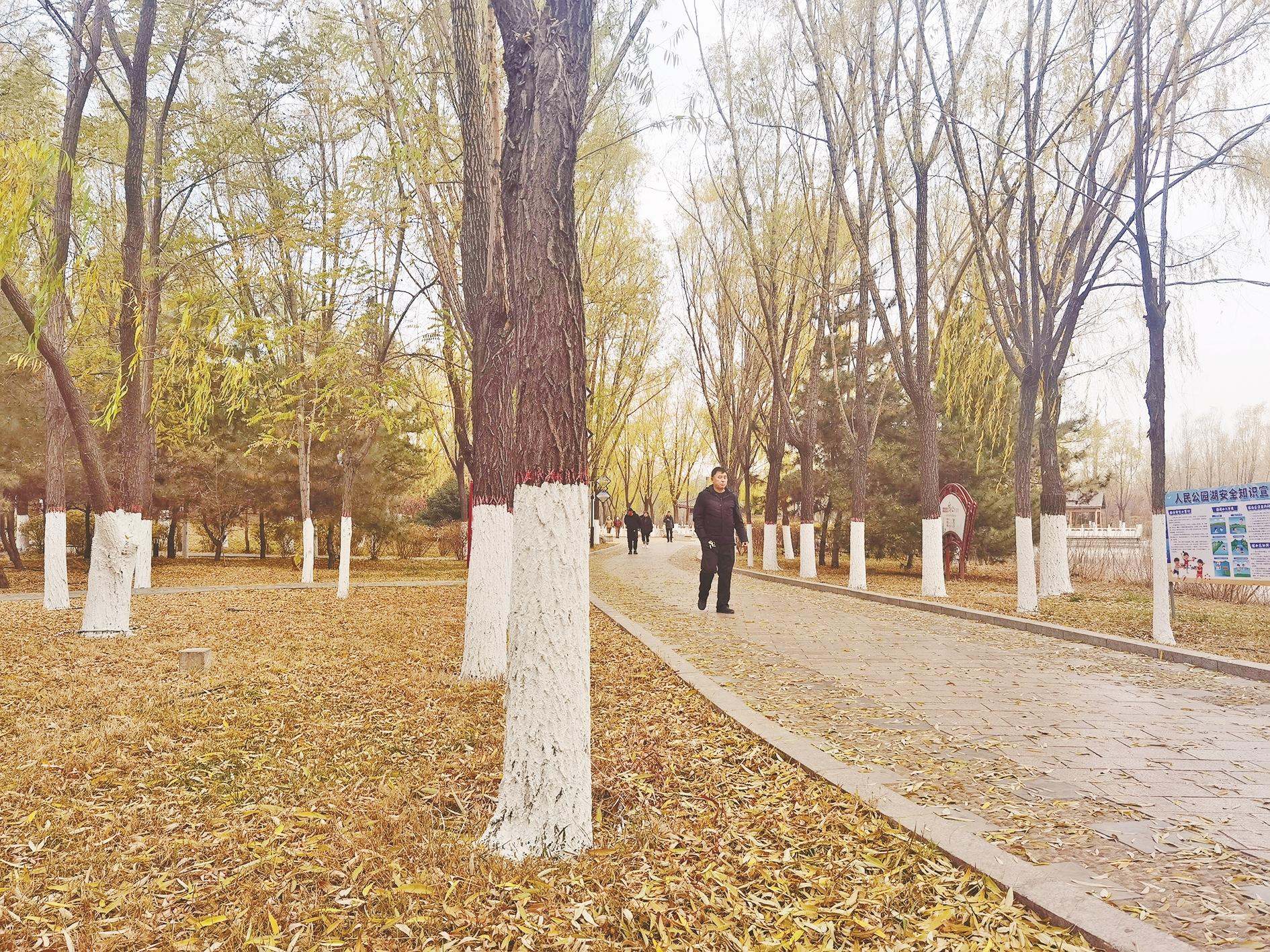 近期,海南区公用事业发展中心组织开展树木涂白行动,做好冬季绿化养护工作。涂白剂能够为树木提供温暖的“保护罩”,也可以杀灭藏在树皮缝隙中的病菌和虫卵,增强树木的抗病虫害能力。图为海南区人民公园的树木已经全部涂白。 (鲁吟 摄)