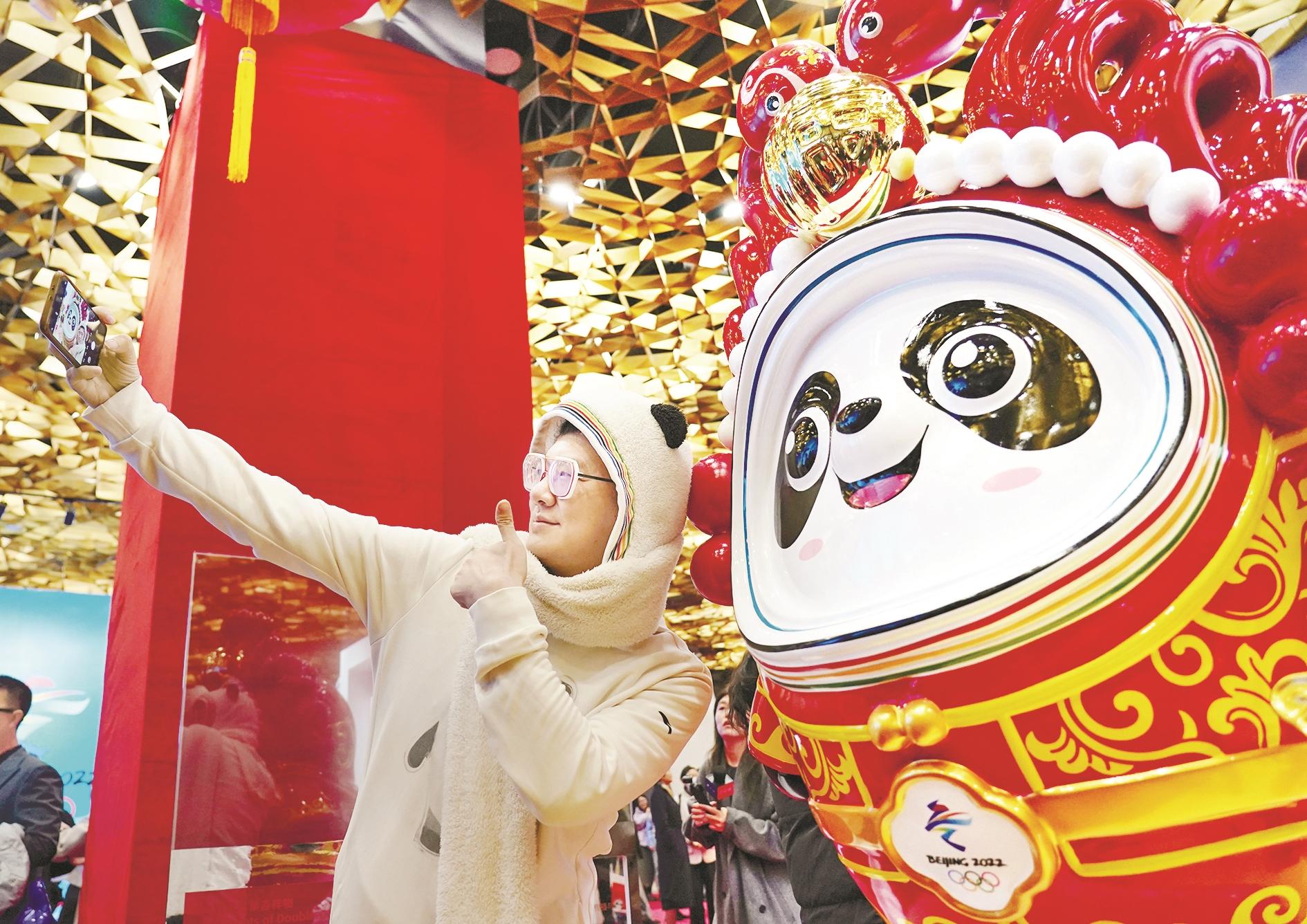 11月19日,参观者在与“蛇墩墩”合影。当日,北京冬奥会吉祥物“冰墩墩”蛇年新春特别版——“蛇墩墩”系列新品在北京发布。据介绍,“蛇墩墩”以民间传说《白蛇传》为灵感来源,头部装饰以传统京剧中的“白娘子”和“小青”造型为蓝本,有“灵蛇献瑞”的寓意。本次活动现场发布的“蛇墩墩”系列新品包括毛绒玩具、徽章、钥匙扣等,其中5个“蛇墩墩”手办备受关注。它们手持如意、葫芦、寿桃、桃花、元宝等道具,分别用福、禄、寿、喜、财表达“五福临门”的美好祝愿,传递幸福与吉祥。