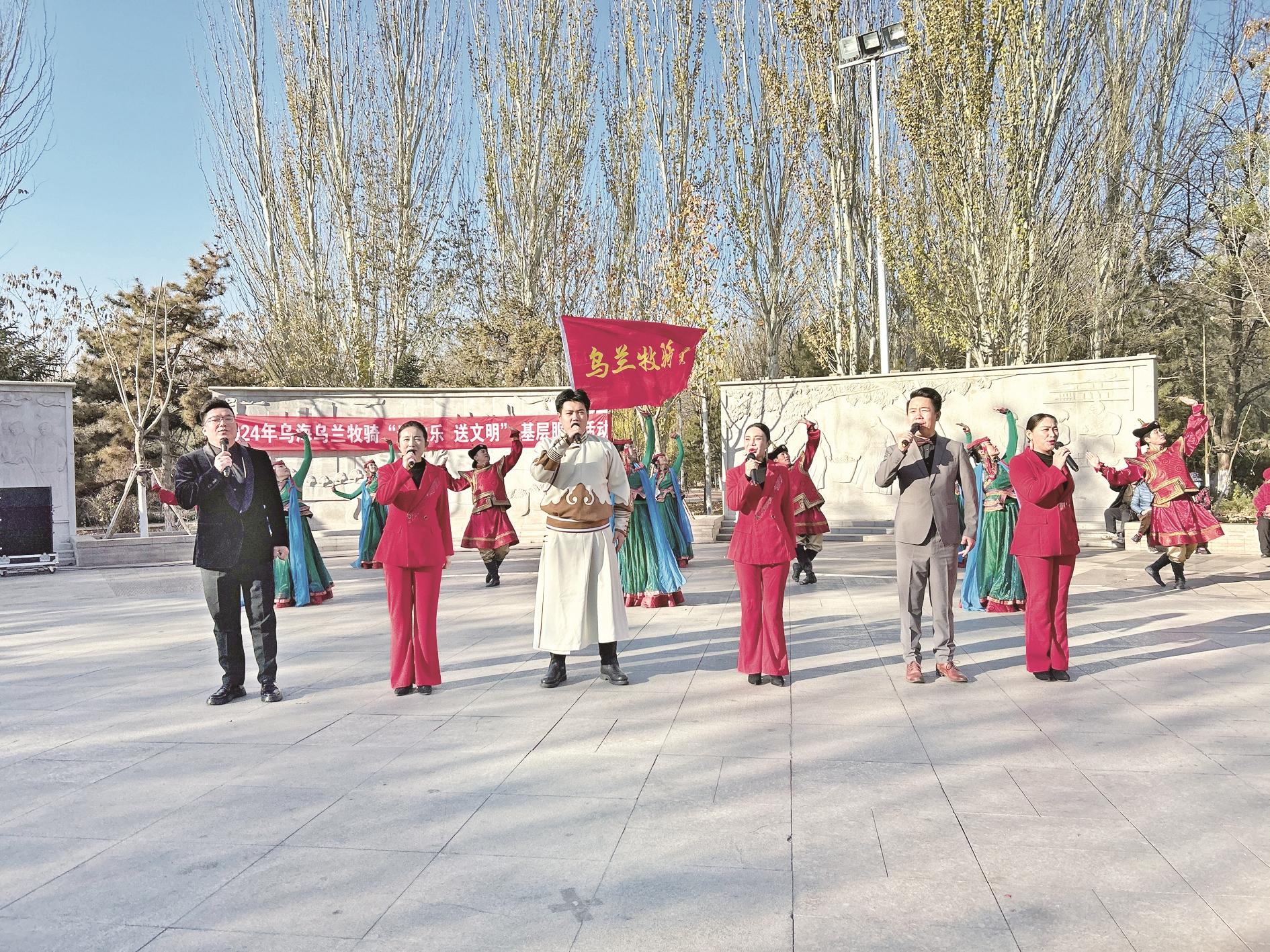 11月21日,乌海乌兰牧骑在市人民公园北门开展2024年乌兰牧骑“送欢乐、送文明”基层服务活动,为群众送上喜闻乐见和富有时代气息的文艺演出。 (姚远 摄)