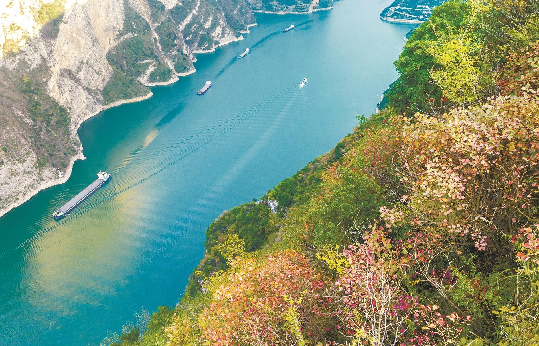 11月20日,船舶行驶在长江三峡西陵峡湖北省宜昌市秭归县水域。初冬时节,长江三峡西陵峡两岸色彩斑斓,好似一幅美丽画卷。 新华社发(郑家裕 摄)