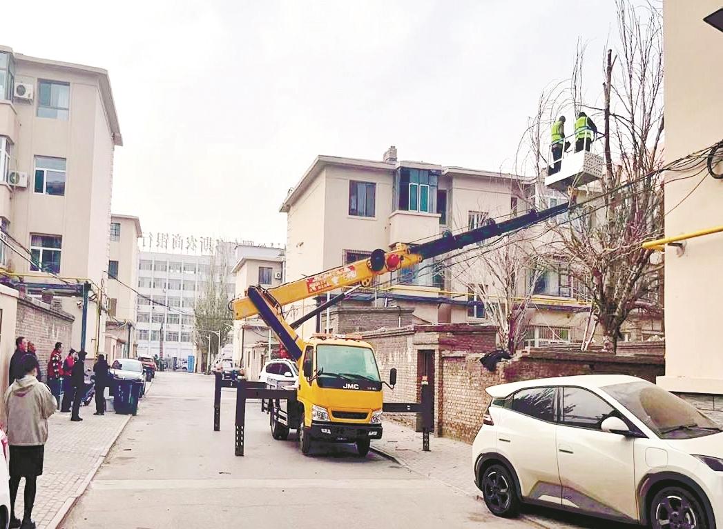 近日,海勃湾区海北街道佳苑社区团结小区居民反映院里的几棵树年久枯萎并发生倾斜,随时有折断掉落的危险。佳苑社区工作人员随即联系了专业人员对这些枯树进行了砍伐,保障居民出行安全。 (毕晓敏 摄)