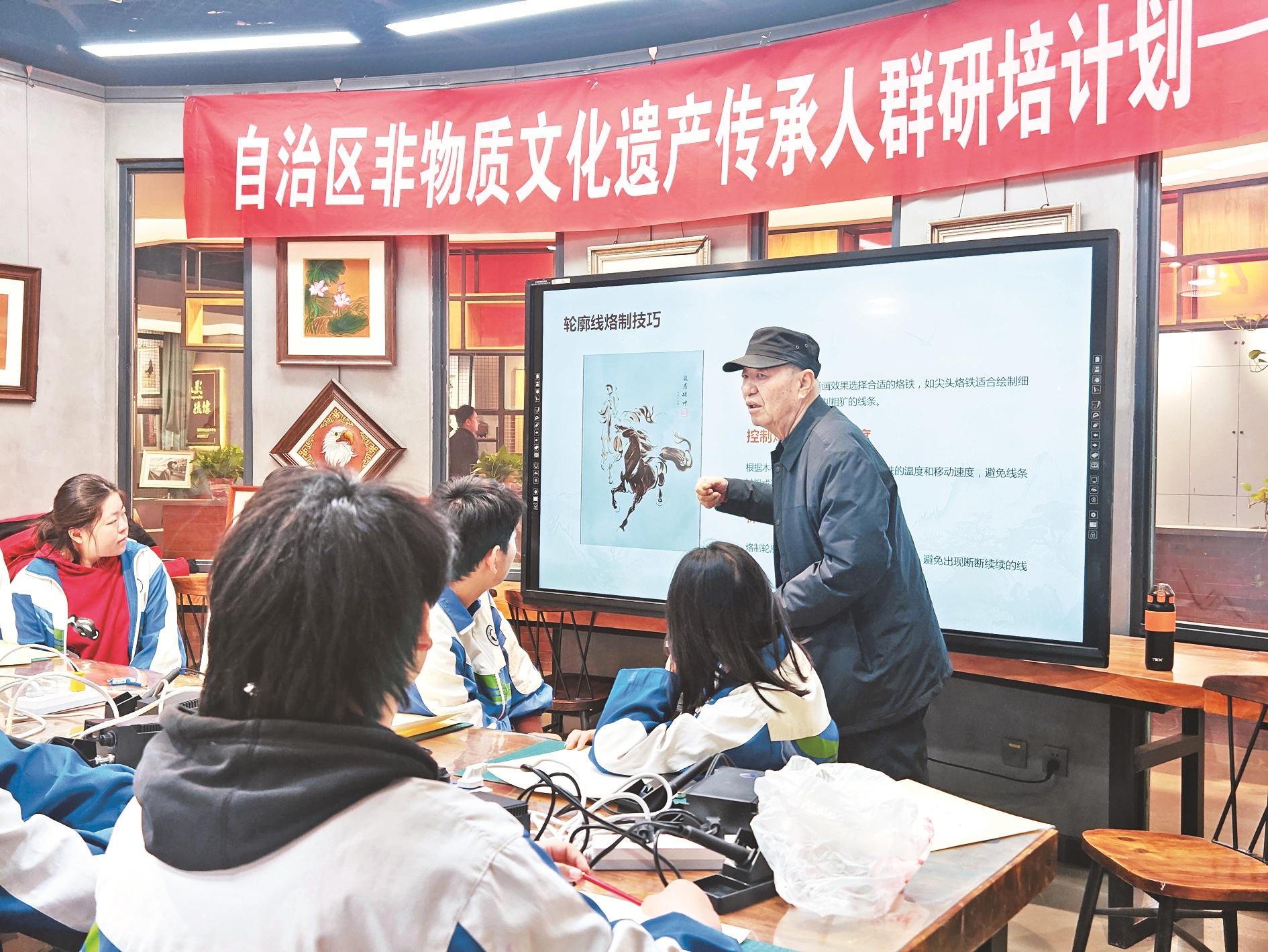 11月22日,由市文体旅游广电局主办的“自治区级非物质文化遗产传承人群研培计划”烫画培训班开班。本次研培班计划安排30课时,培训学员40人,培训内容包括牛皮烫画、宣纸烫画和葫芦烫画,旨在进一步提升传承人的学习能力和传承水平,为传统工艺与大众生活搭建学习交流平台。(靳婧 摄)
