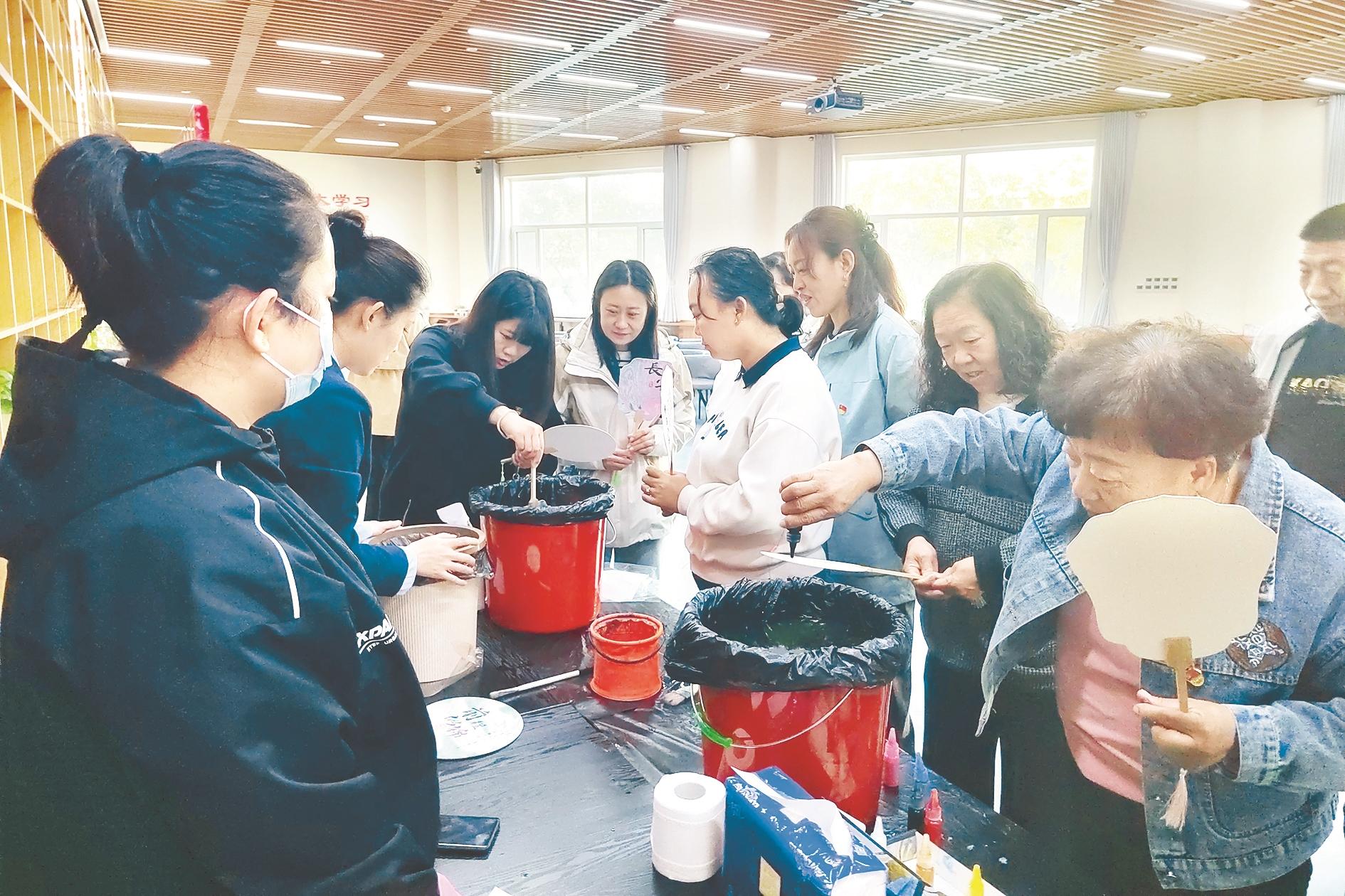 近日,海勃湾区新华街道新海社区开展了“‘漆’彩纷呈‘扇’染秋色”漆扇制作活动。活动中,工作人员为居民群众讲解了中国漆扇的历史起源和制作工艺,大家在工作人员的指导下,经过配色、稀释、调漆、沉扇等环节,制作出一幅幅独一无二的漆扇作品。 (黄建飞 摄)