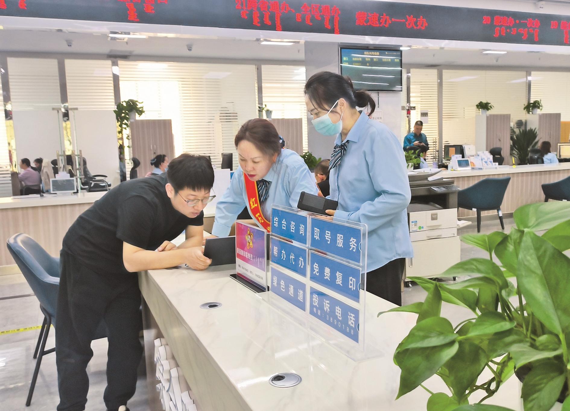 我市从企业和群众视角出发,不断优化政务服务窗口服务质量,最大限度利企便民,优化营商环境。图为近日,海勃湾区政务服务中心工作人员耐心指导群众办事。(路静 摄)