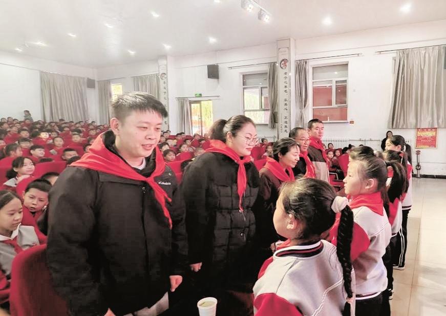 近日,海勃湾区新华西街道“红石榴”宣讲团走进海勃湾区第一小学新桥大街校区,开展“传承‘五老’精神 做有理想少年”主题宣讲活动。图为少先队员为宣讲团成员佩戴红领巾。 (毕晓敏 摄)