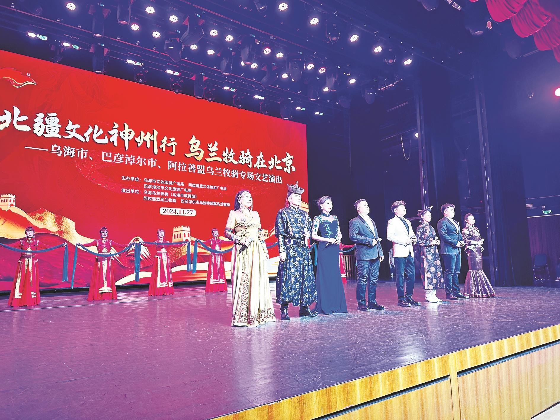 本报讯 (记者郑彩虹)11月27日晚,“北疆文化神州行 乌兰牧骑在北京”——乌海市、巴彦淖尔市、阿拉善盟乌兰牧骑专场文艺演出在北京市东城区文化馆举行。