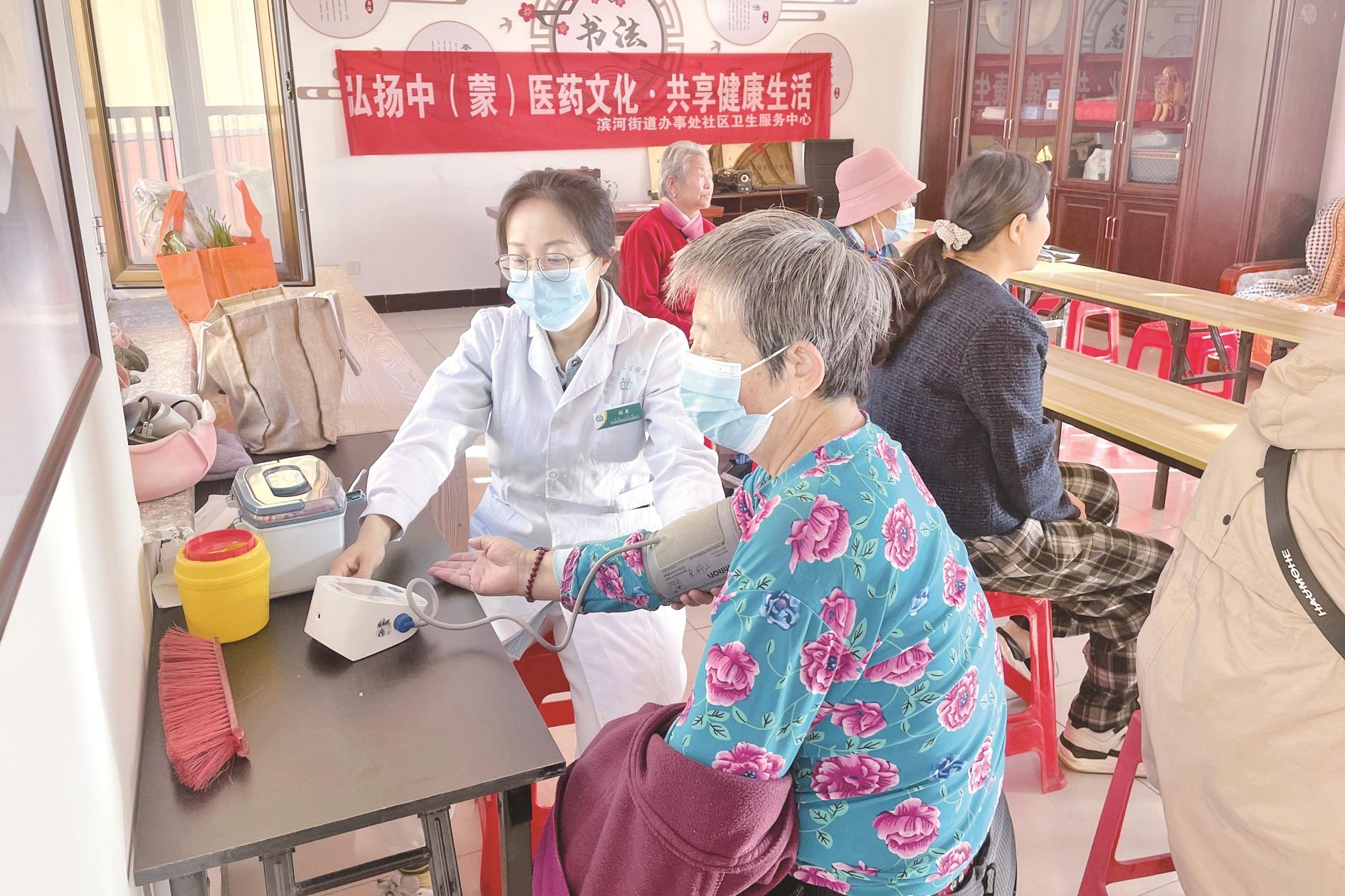 近日,海勃湾区滨河街道白楼社区开展了义诊志愿服务活动,医疗机构医务人员为辖区居民测血糖、量血压、做B超等,并对患有常见慢性病的居民的生活、治疗等方面提出指导意见。(黄建飞 摄)