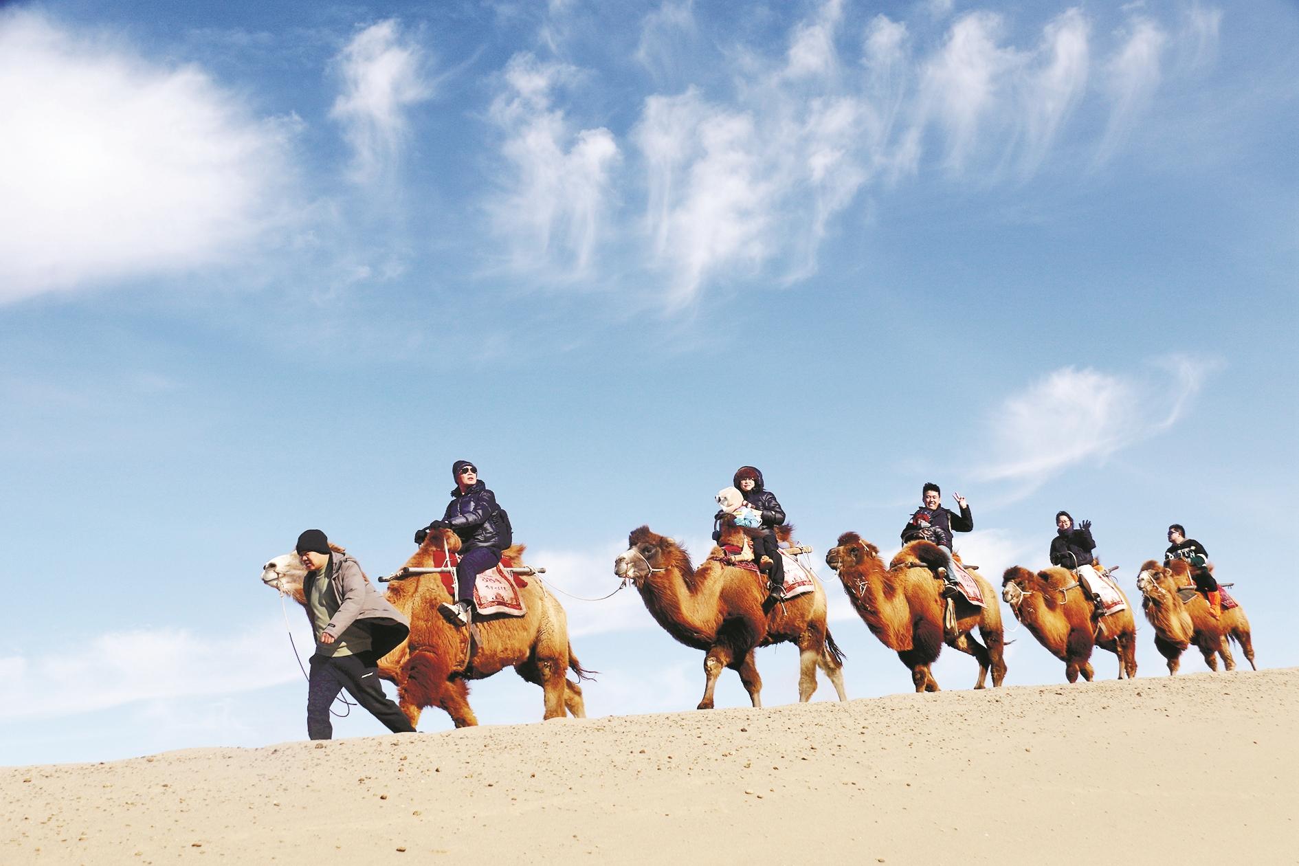 12月1日,游客在甘肃省敦煌市鸣沙山月牙泉景区骑骆驼游览。从12月1日开始,甘肃省敦煌市2024-2025年度研学季、会展季暨冬春旅游优惠措施正式开始执行,至2025年2月28日,敦煌市鸣沙山月牙泉、玉门关、敦煌雅丹世界地质公园三家市属景区对国内外所有游客免门票,莫高窟门票实行半价优惠,开放洞窟由8个增至10个,并对研学团队适当增加开放洞窟,配备资深讲解员。此外,敦煌市还推出助力招展引会、支持驻场演艺、培育航线航班等一系列奖补政策措施,激发冬春旅游市场活力。