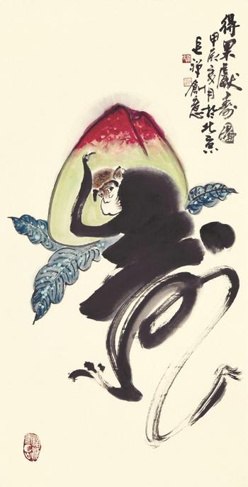 梁建甫的每一幅作品都经过精心构思,布局巧妙、主次分明。他善于捕捉自然界中那些动人的瞬间,将其定格在画面之中,花鸟的姿态、神情无不栩栩如生,仿佛从自然中直接移植而来。当然,这并非简单的模仿,而是画家在专注的观察和领悟之后进行的艺术再创造。他以独特的视角和手法展现自然之美,让我们看到寻常中的不寻常,既感受到大自然的神奇动人,也感受到花鸟画中所蕴含的人情美善。作品《得果献寿图》便是一个例证。四尺生宣上,斗大的寿字跃然纸上,接着用小笔于寿字肩膀处勾勒出回望的猴头和上下两肢,又取色笔勾染仙桃及叶子。观此作品,寿是字亦是猴身,一点重墨放在猴尾,使画面跳跃中有稳重、灵动中见沉着,为祝寿奔跑而来的灵猴谦恭中带着俏皮,急切里蕴含吉祥,栩栩如生、呼之欲出。祝寿图作为一种吉祥图符,是孝道文化的重要组成部分,它通过具有特定寓意的图文符号来表现健康、长寿之祈愿,不仅具有极高的艺术欣赏价值,还承载着中华民族深厚的文化传统和情感寄托。