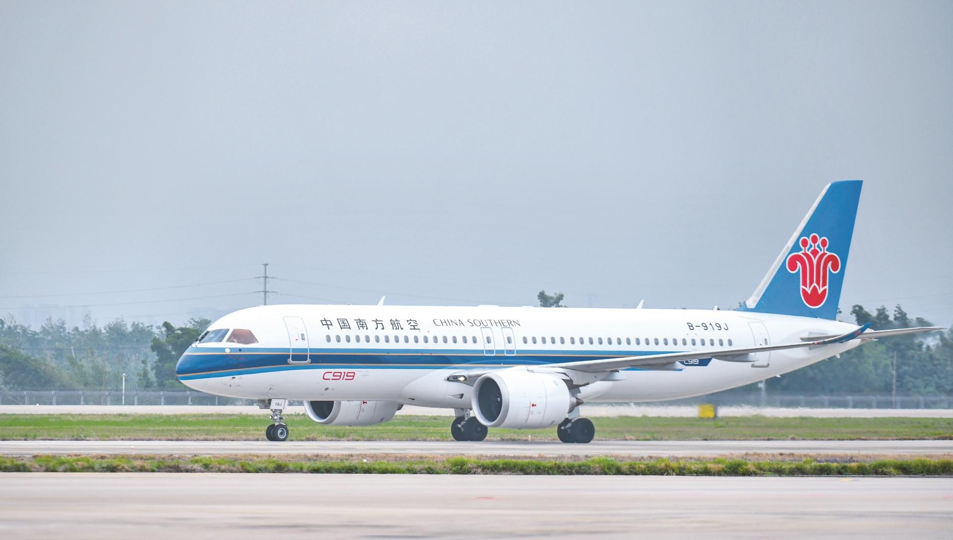 12月11日,由C919执飞的中国南航CZ6786航班在海口美兰国际机场降落。12月11日12时57分,由C919执飞的中国南航CZ6786航班从广州飞抵海口,国产大飞机C919在海南的商业飞行“首秀”顺利完成。据悉,这是中国南航首次使用C919飞机执行广州-海口“南航快线”航班,也是中国南航使用国产大飞机执飞的第4条航线,海口成为中国南航C919飞机继广州、上海虹桥、杭州、成都天府后执飞的第5个航点。 新华社记者 杨冠宇 摄