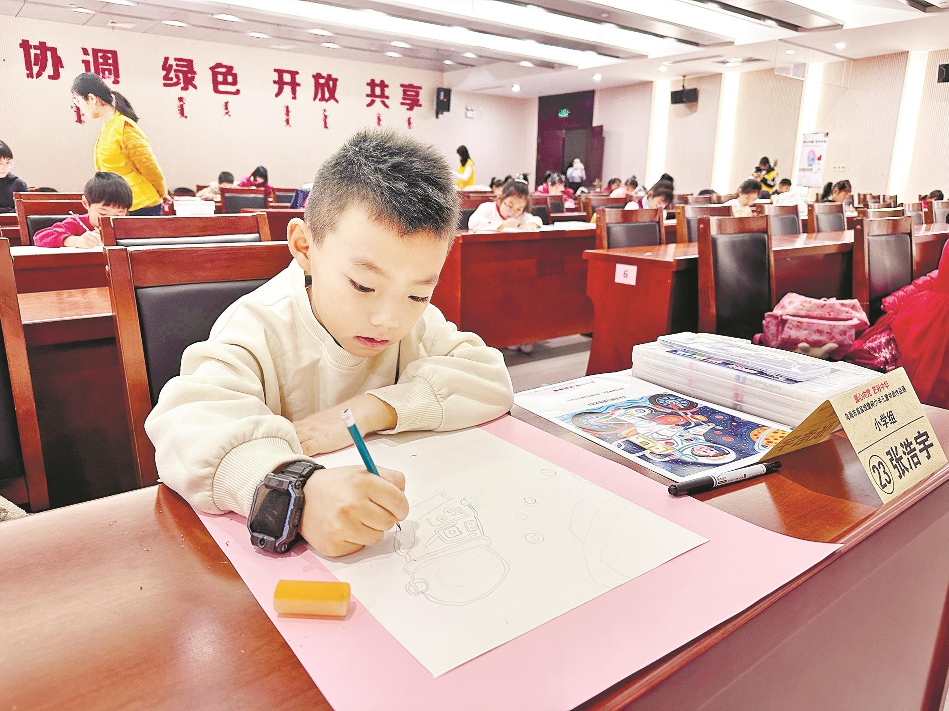 12月14日,乌海市首届雏鹰杯少年儿童书画作品展在当代中国书法艺术馆举行。本次活动分为幼儿、小学、初中3个组,共53名学生参加。活动特别设置了现场绘画环节,孩子们的作品内容丰富多样,充分展现了独特的艺术视角和丰富的内心世界。(王蒙 摄)