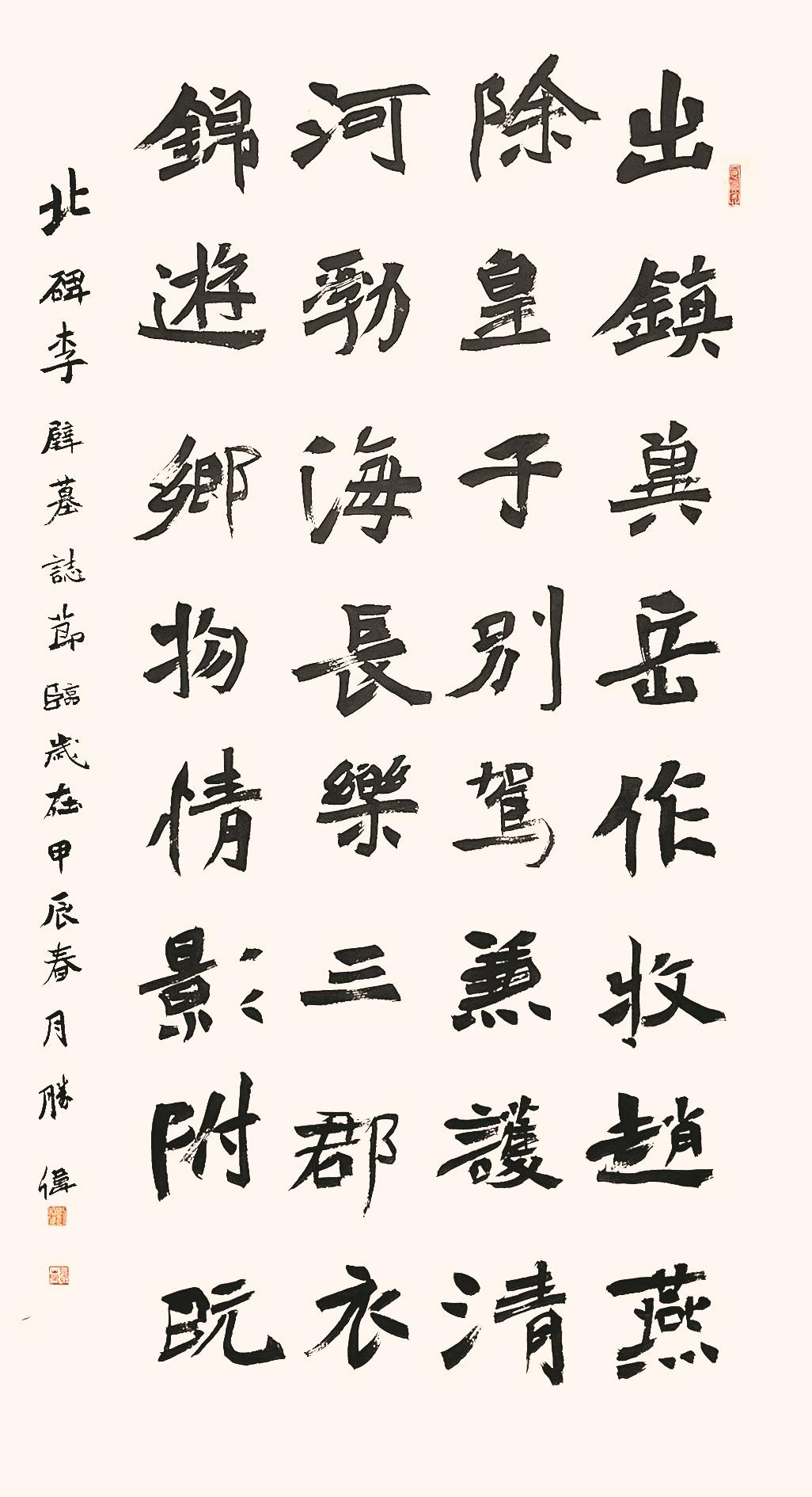 刘胜伟跟随崔宝全学习了7天。崔宝全告诉他书法的各种书体,颜体的字形、结构、线条等,为他写示范字,给他说了不少临帖的小技巧。崔宝全还送给他一本《多宝塔碑》书帖,鼓励他好好练习。“崔老师虽说只教了我7天,但我一直把崔老师当作我书法路上的领路人。老师7天休假结束离开后,我每天在家看着书帖临帖。”刘胜伟说。初高中时,因为学业的压力,刘胜伟临帖的时间少了,可每逢休息日和假期,他都会写一会儿。高中毕业后,刘胜伟参军入伍。因为有写字画画的特长,他担任连队文书,在军营中出墙报、写对联、文章等,让他一直保持创作的手感和黏性,这为他后续系统性地学习书法打下了坚实基础。
