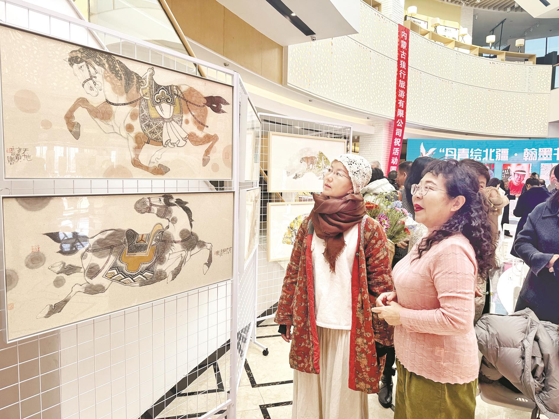 12月13日,“丹青绘北疆·翰墨书乌海”书画巡回展在阅遇书吧开幕,共展出葛新华、白占荣、马胜利、郭建国、方宝龙、孟凡书、王燕7位书画家的258幅作品。图为市民在观展。 (张靖爽 摄)