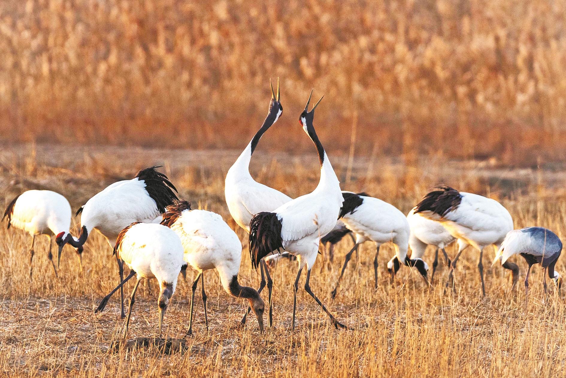 12月15日,丹顶鹤在江苏盐城湿地珍禽国家级自然保护区内栖息觅食。目前,大批丹顶鹤飞抵江苏盐城湿地珍禽国家级自然保护区越冬。该保护区位于黄海之滨,是全球9条候鸟迁飞通道之一的“东亚—澳大利西亚”路线上的重要一站,每年都有超过600只野生丹顶鹤来这里越冬。 新华社发(汤德宏 摄)