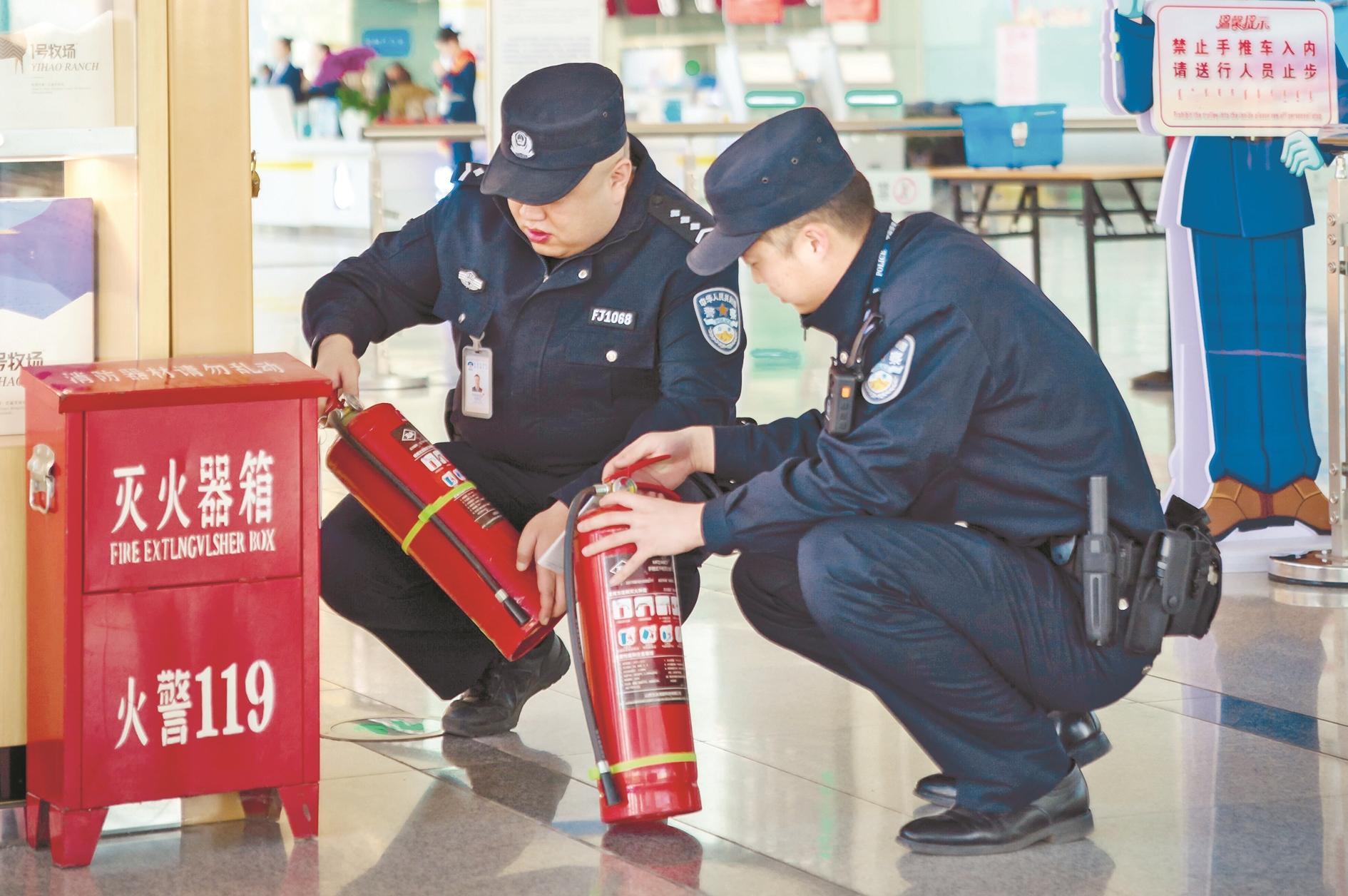 近日,市公安局公共交通分局机场派出所对乌海机场候机楼、飞行区仓库、塔台等部位开展安全隐患排查,全面检查隐蔽报警系统、消防器材、监控系统设施使用情况,并查看相关点位用电安全、应急预案、安全培训台账,全面筑牢安全屏障。 (曹艺 摄)