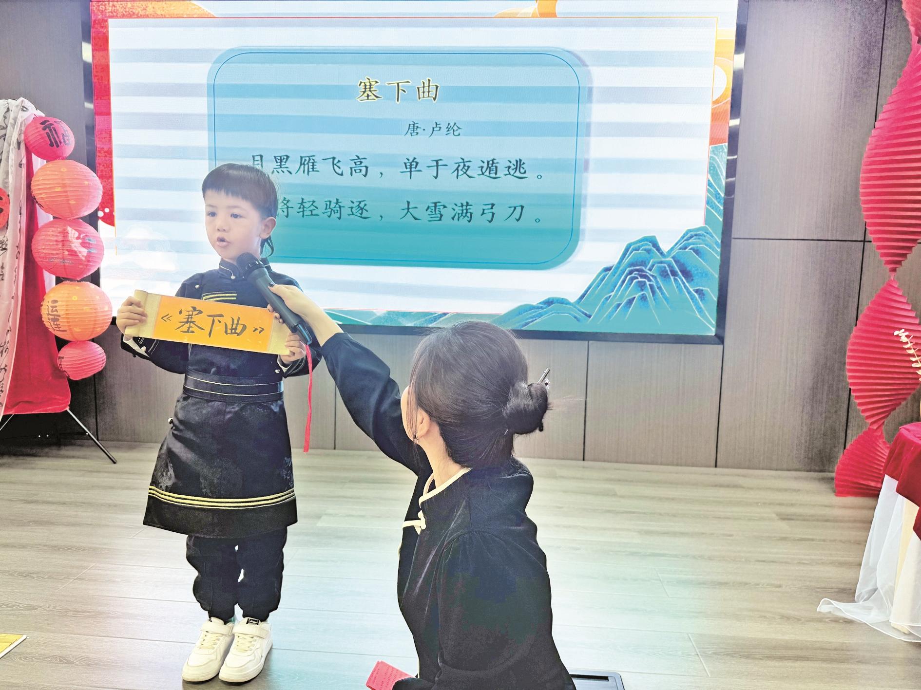 12月19日,海勃湾区第十五幼儿园举办“诗词润童心,经典永流传”主题活动,引领小朋友们与经典古诗词来一场穿越时空的对话,与传统文化赴一场诗词飘香之约。图为参赛幼儿上台背诵古诗词。 (张靖爽 摄)