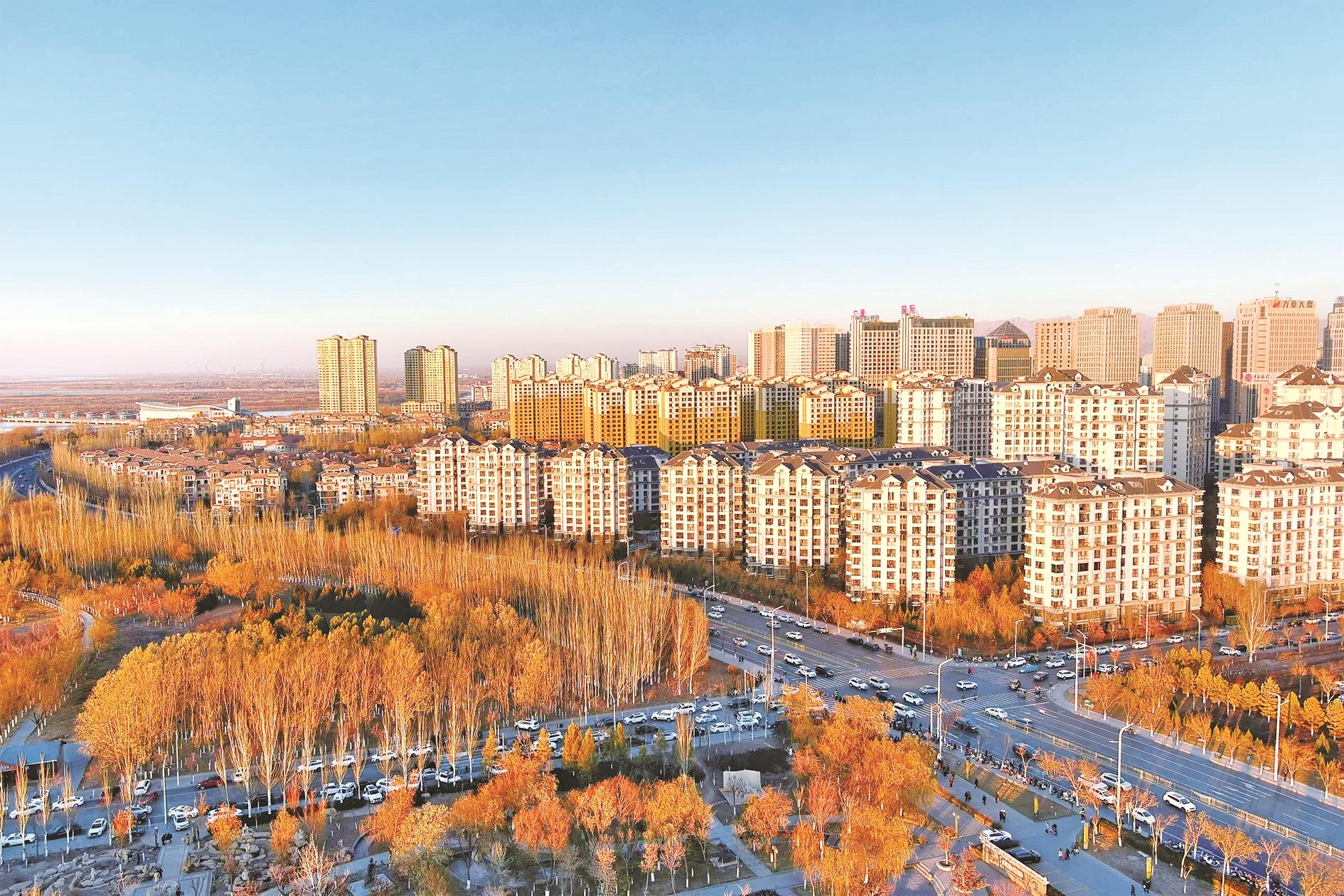 12月22日,晚霞映照下的海勃湾区滨河新区层林尽染,一片金黄,高楼大厦和树木相映成景,呈现出一幅祥和的冬日画卷。(王超 摄)