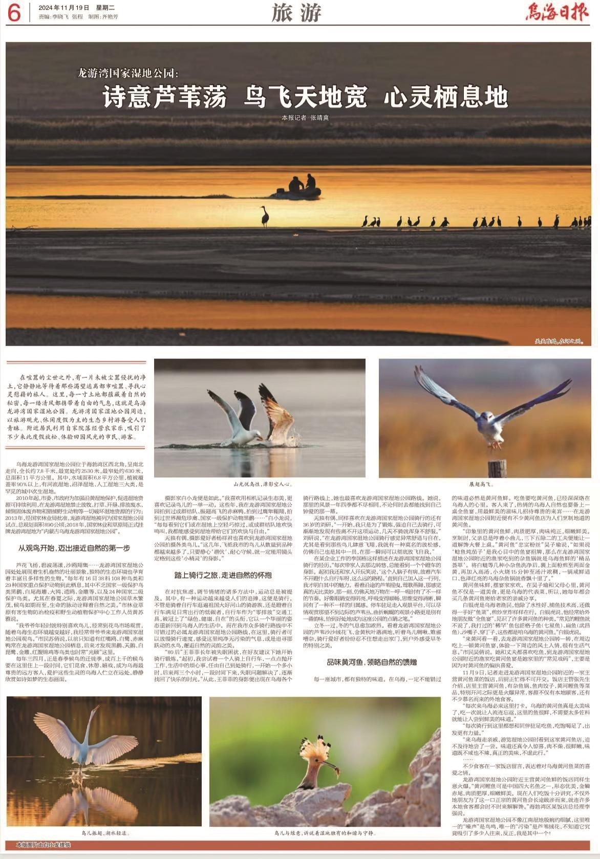 乌海龙游湾国家湿地公园位于海勃湾区西北角,呈南北走向,全长约7.8公里,最宽处约2530米,最窄处约630米,总面积11平方公里。其中,水域面积6.8平方公里,植被覆盖率90%以上,有河流湿地、沼泽湿地、人工湿地三大类,是罕见的城中次生湿地。在文章《龙游湾国家湿地公园:诗意芦苇荡 鸟飞天地宽 心灵栖息地》中,记者从观鸟、骑行、品黄河鱼三方面采写龙游湾国家湿地公园及周边的生态乡村游,吸引了不少来此度假放松、体验田园风光的市民、游客。