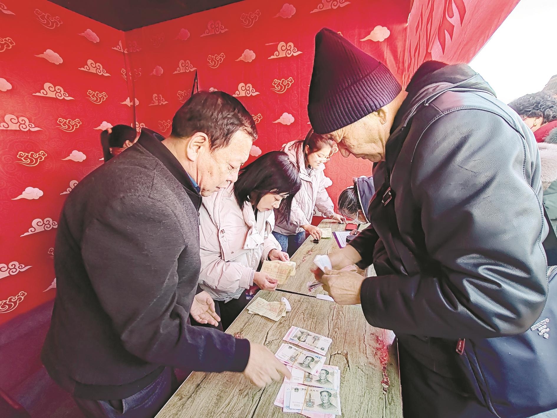 现场挤满了来自四个村民小组的集体经济组织成员,在村“两委”、驻村工作队员等人的帮助下,入股村民有序排队、登记、签字、摁手印、领取分红现金。村民手中拿着沉甸甸的红包,心中充满喜悦。
