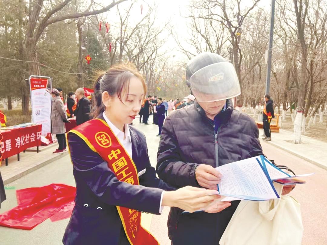 近日,工行乌海分行工作人员走进社区、公园向市民发放防诈宣传资料,讲解电信诈骗案例,普及金融知识,共同守护居民钱袋子。 (陈洋 摄)