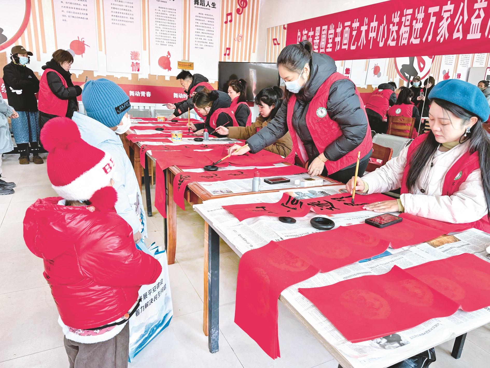 2024年12月27日,乌达区乌兰淖尔镇富民社区举办“迎新春 庆元旦”年货大集活动。图为书法爱好者现场为居民书写春联。 (段维娜 摄)