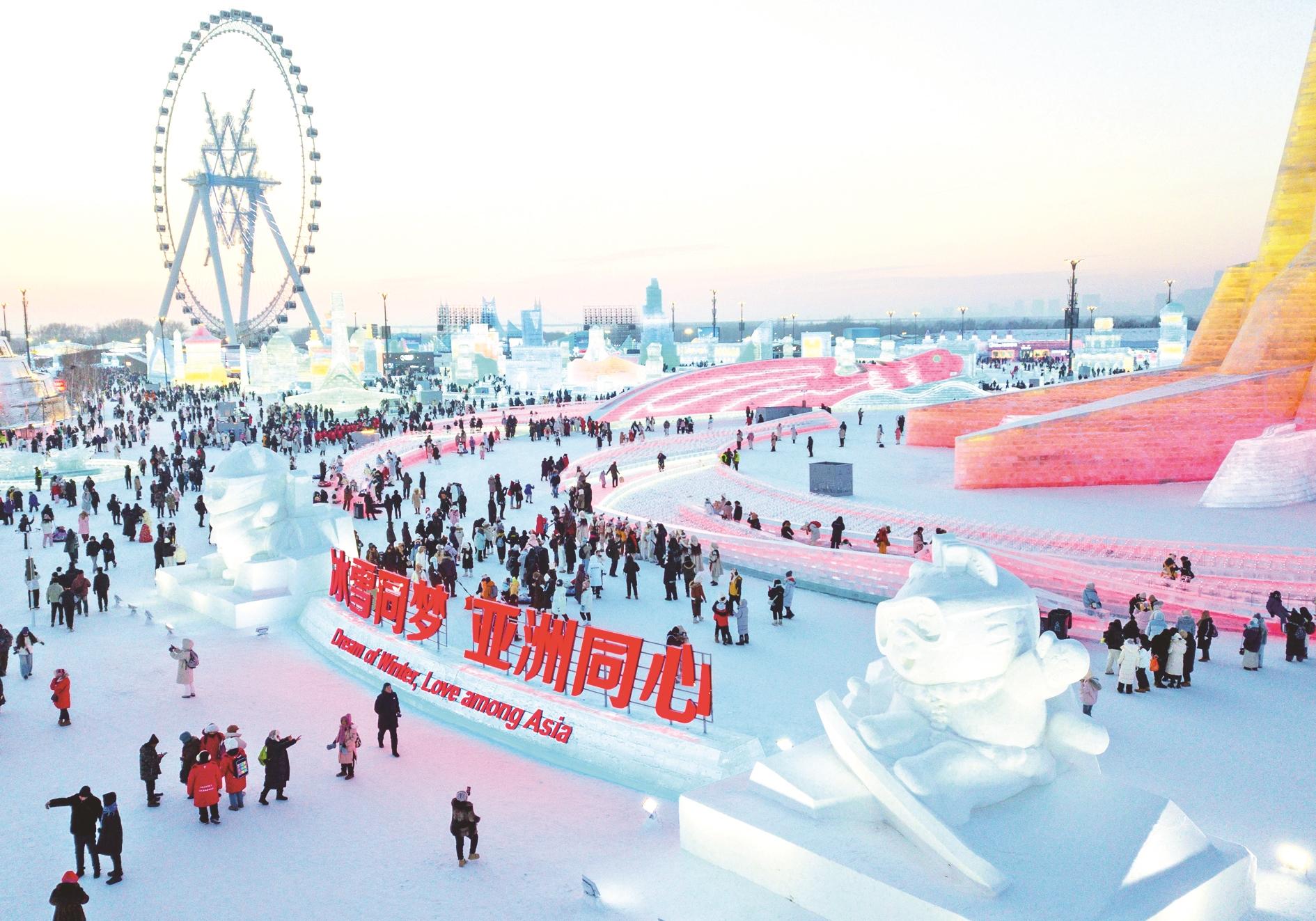 在这座冰雪之城,冰灯、冰雕、冰爬犁、抽冰嘎、毛皮板滑雪等老式技艺焕发新生机,“雪国列车”、冰雪音乐会、“万人雪地蹦迪”等新业态、新场景为冰雪文化注入新活力。哈尔滨冰雪大世界、中央大街、太阳岛雪博会、极地公园、东北虎林园、伏尔加庄园等热门景点被游客纷纷“种草”。