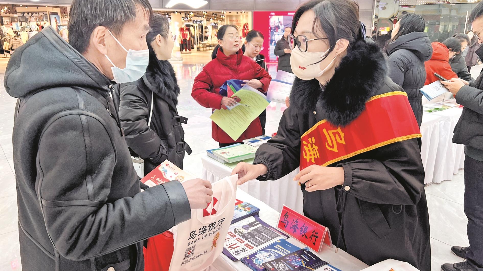 近日,乌海银行隆昌支行工作人员来到乌海万达广场,向市民宣传金融知识,讲解电信诈骗案例,增强市民反诈意识。 (陈洋 摄)