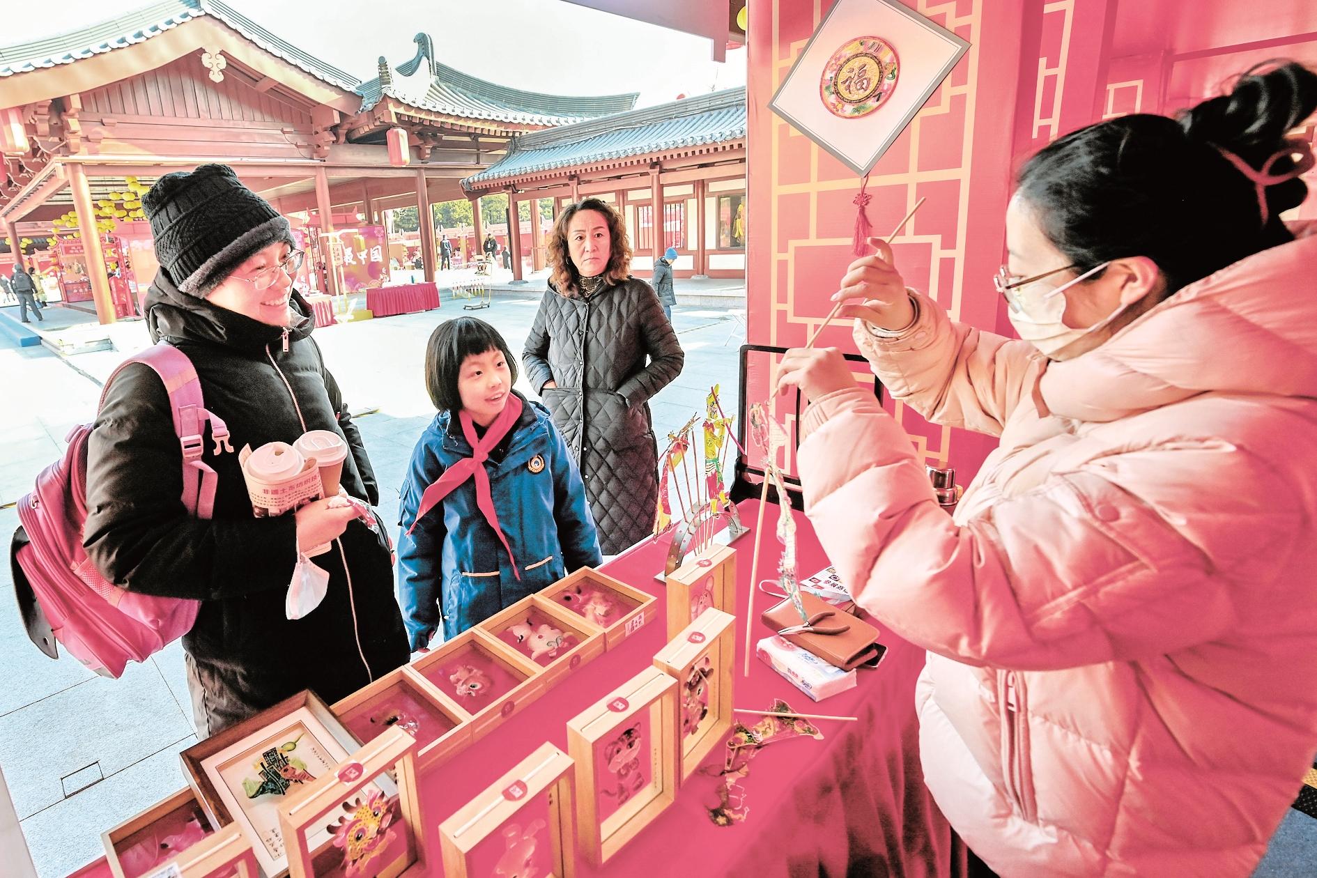 1月8日,市民在西安大唐芙蓉园内的非遗年货集市上选购汪氏皮影文创产品。1月7日,2025年“非遗好物 国潮焕新——四季非遗购物月”一季度活动在陕西西安启动。活动期间,全国各地的非遗好物齐聚集市,丰富春节期间非遗产品供给。 新华社记者 邹竞一 摄