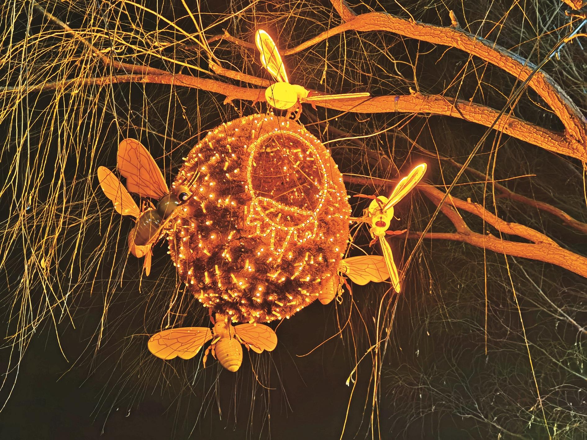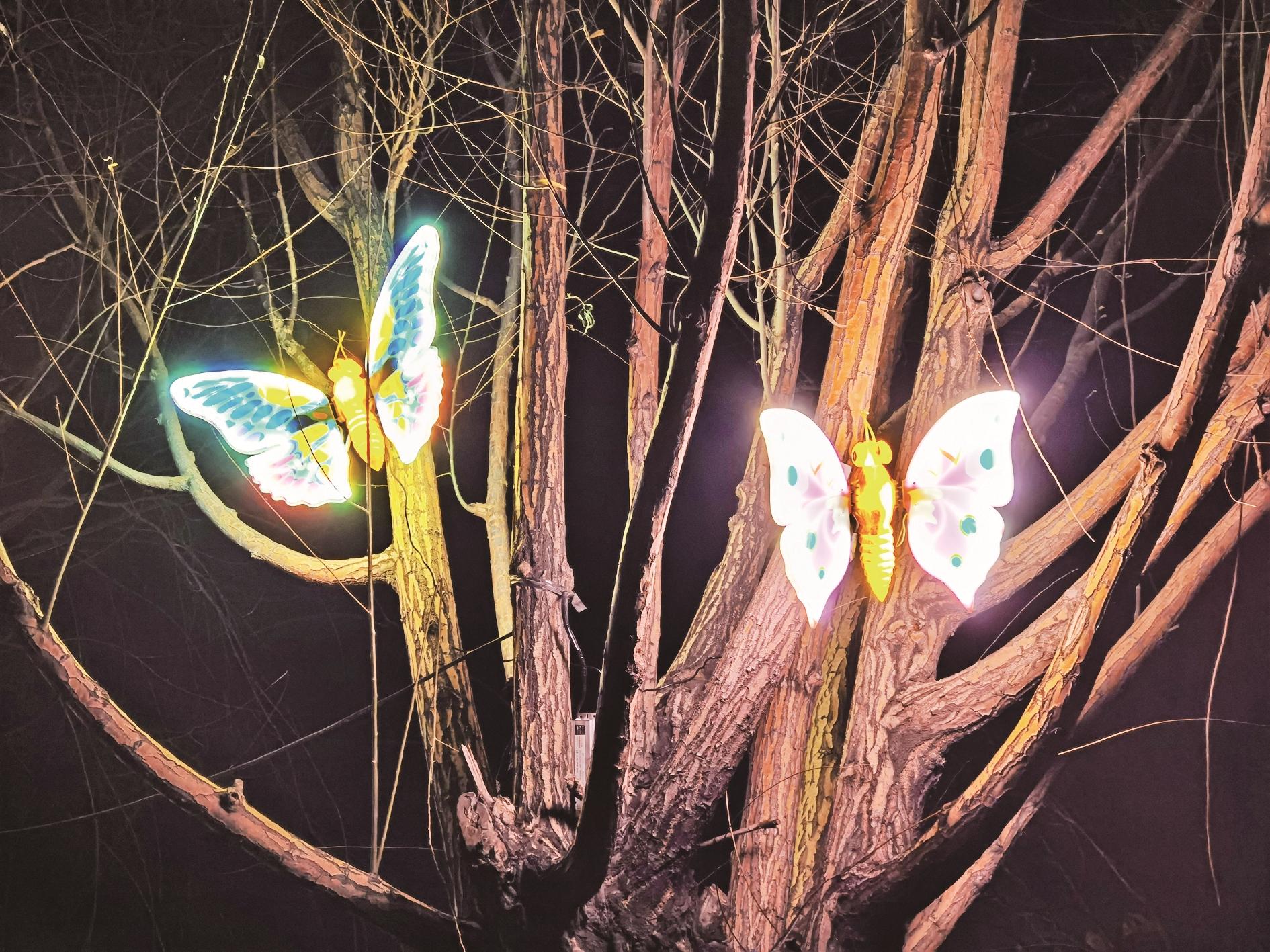 不远处的乌达区人民公园北门附近,蜻蜓、蝴蝶、蜂巢栖息在树枝间,当风吹过,这些“动物”随风摇曳,好似活了过来。维邦公园外,几只“小鹿”在草地上玩耍,随心情变换着颜色,新奇而有趣。