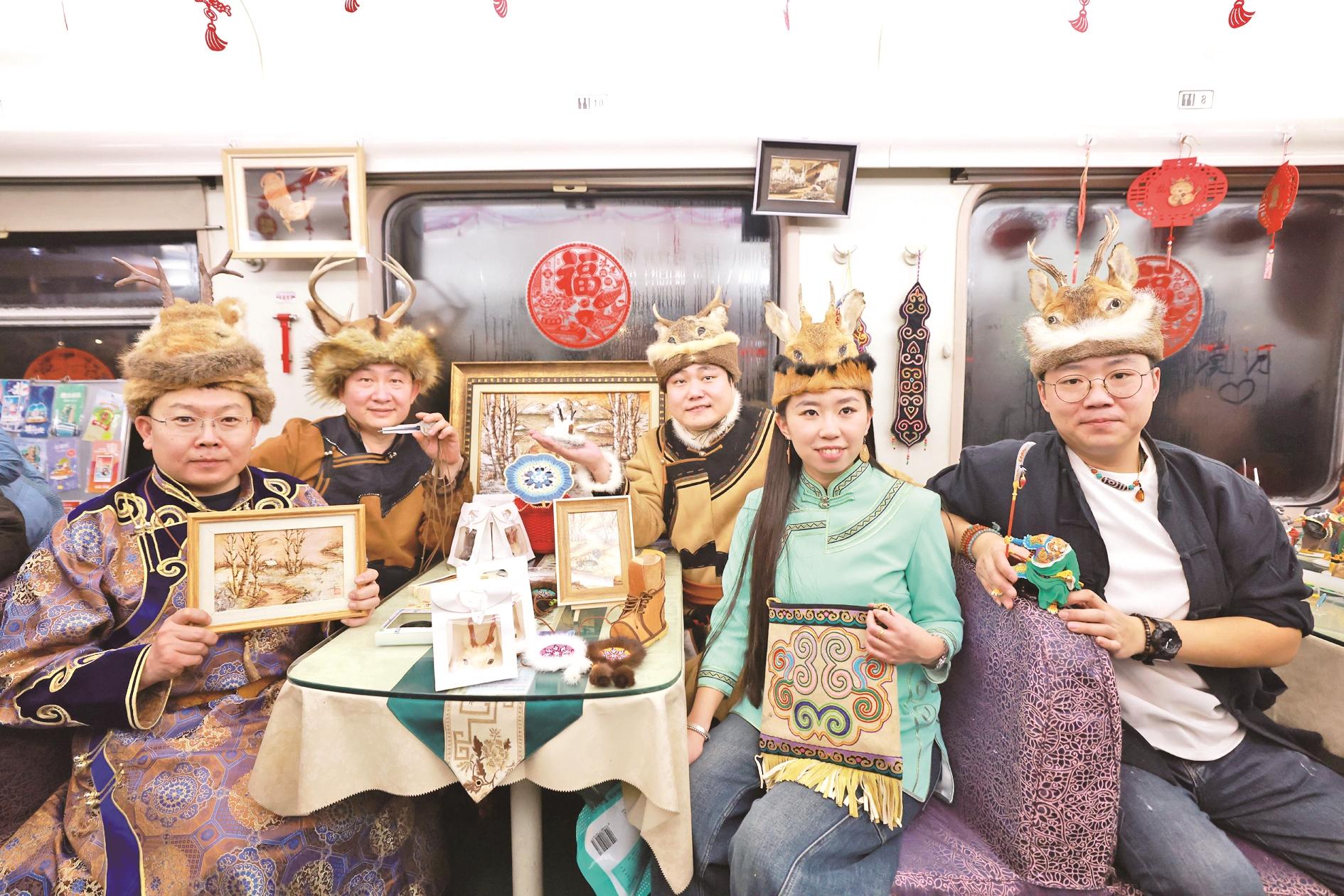 1月11日,在哈尔滨开往漠河的K7041次列车上,五名鄂伦春族非遗文化传承人为旅客展示非遗项目。
