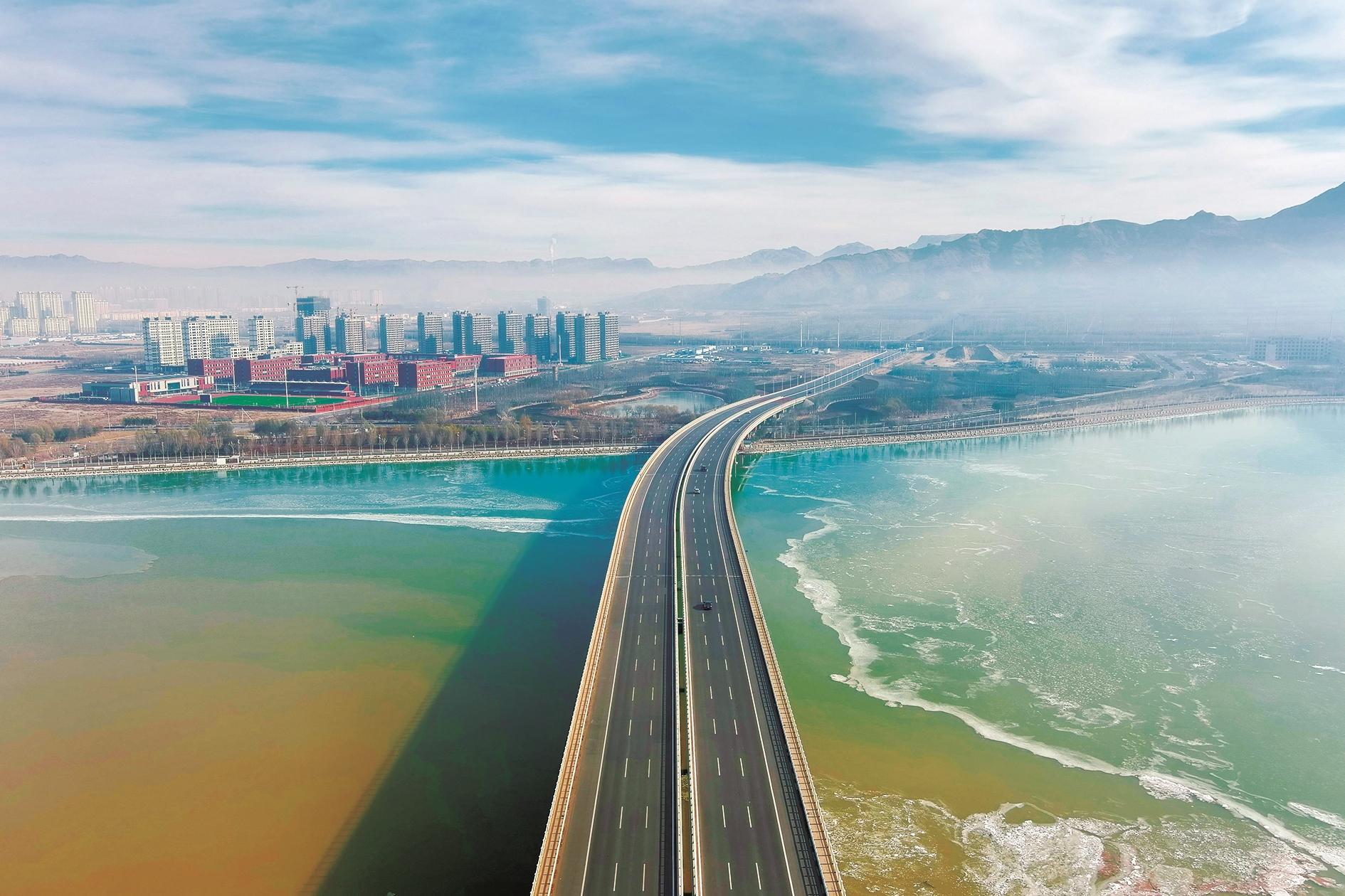 深冬时节,黄河岸畔风光如画。图为1月13日,乌海湖大桥与远处的山峦、城市交相辉映,绘就了一幅冬日特有的多彩画卷