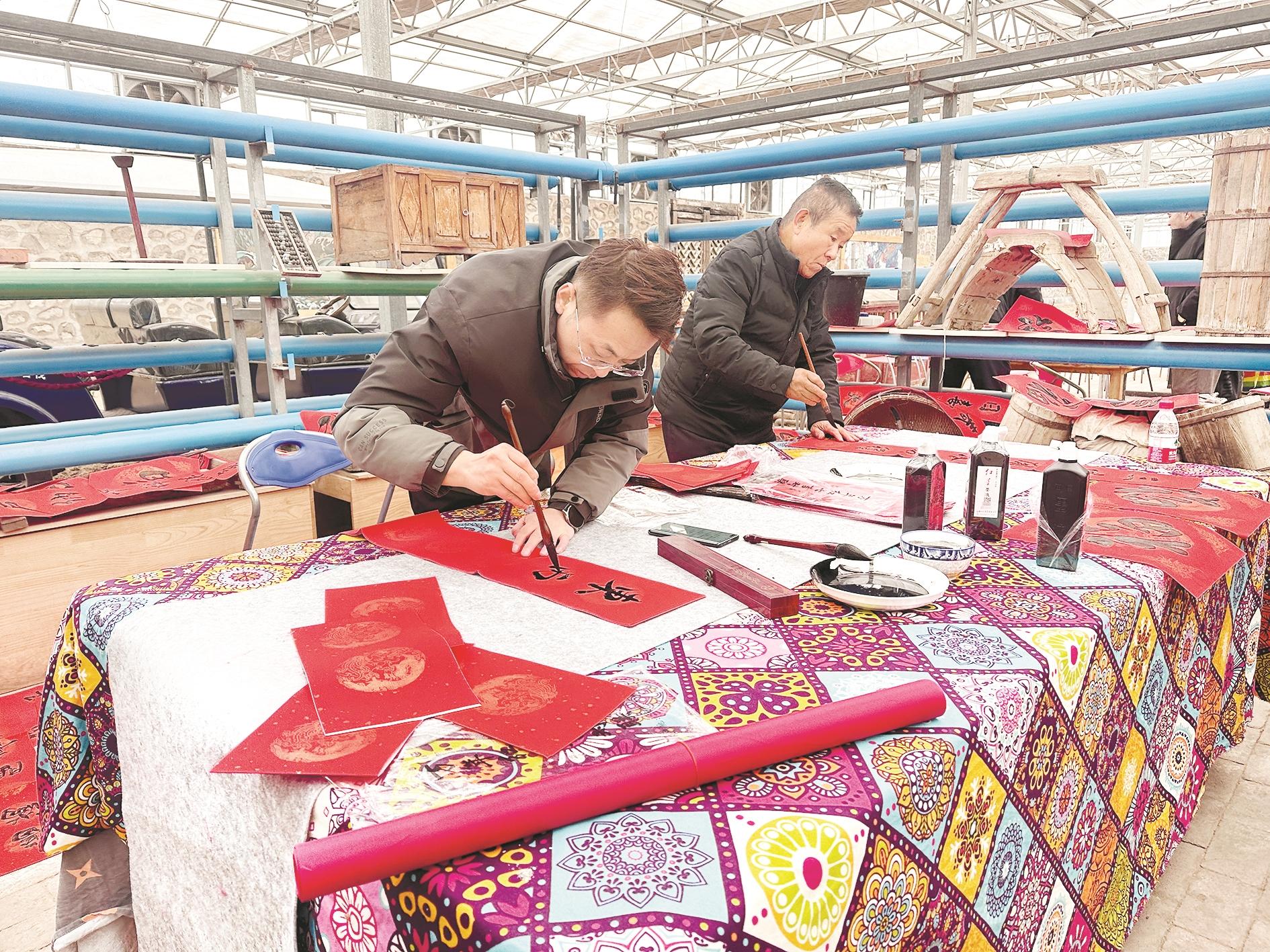拉僧庙镇第一届非遗文化民俗年货节上,书法爱好者书写春联。 (王蒙 摄)