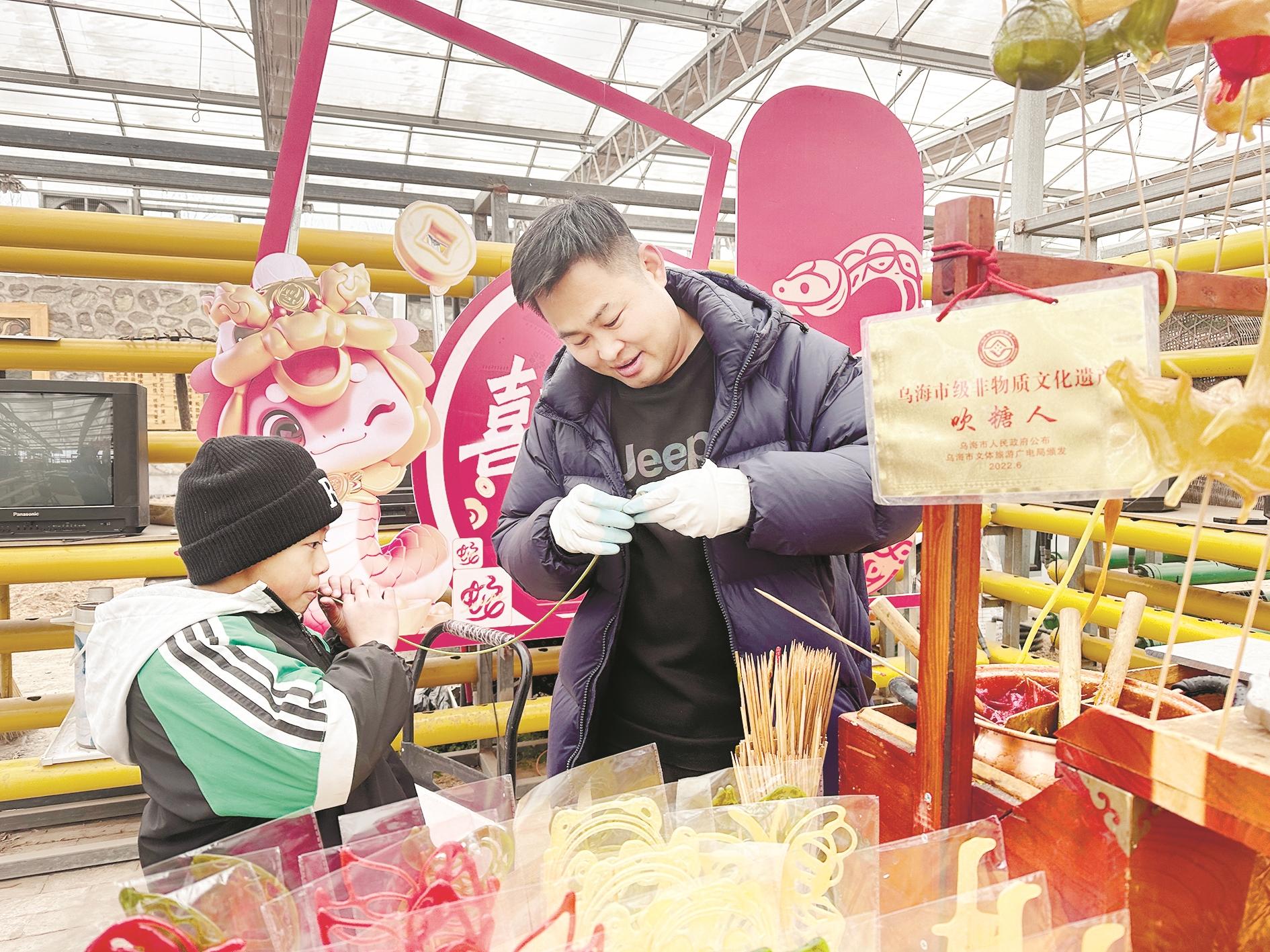 拉僧庙镇第一届非遗文化民俗年货节上,小朋友正在体验捏糖人。 (王蒙 摄)