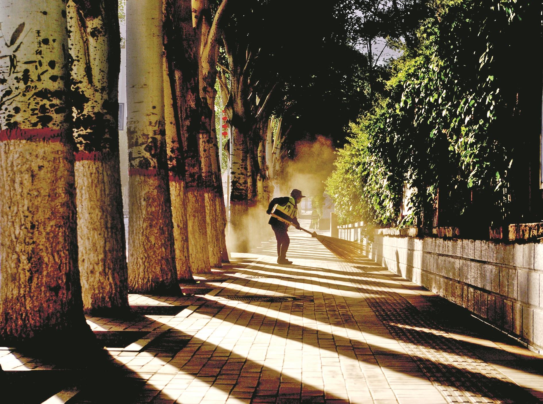 她根据征稿要求,确定拍摄主题,将镜头对准环卫工人。为拍出环卫工人最真实的工作场景,沈树林拿出自己最好的摄影装备。她踌躇满志,现实却给了她当头一棒。首次拍摄,沈树林早早地起床,却依然去晚了,她败兴而归。第二次拍摄,她更早起床,由于去得太早,天很黑,自然光线不好,她拍了几十张,没有达到自己的标准,那一天她闷闷不乐。第三次拍摄,她选择自然光线较好的时间去拍摄。“我去现场等了一会儿,环卫工人到现场开始工作。当时天蒙蒙亮,光线比较柔和,我抓住时机,拍了100多张环卫工人工作的照片。当时天气已经很冷了,拍照的时候没感觉,回家后才感觉自己冻得不行了。”她说。这次拍摄,沈树林拍到了满意的照片,她选择其中最好的一张寄给展览组委会。最终,她拍摄的照片《晨》顺利入展。“首次投稿就入展,真是很鼓舞我。摄影展开幕当天,我专门去看,还与自己入展的照片合了个影。”沈树林笑着说。