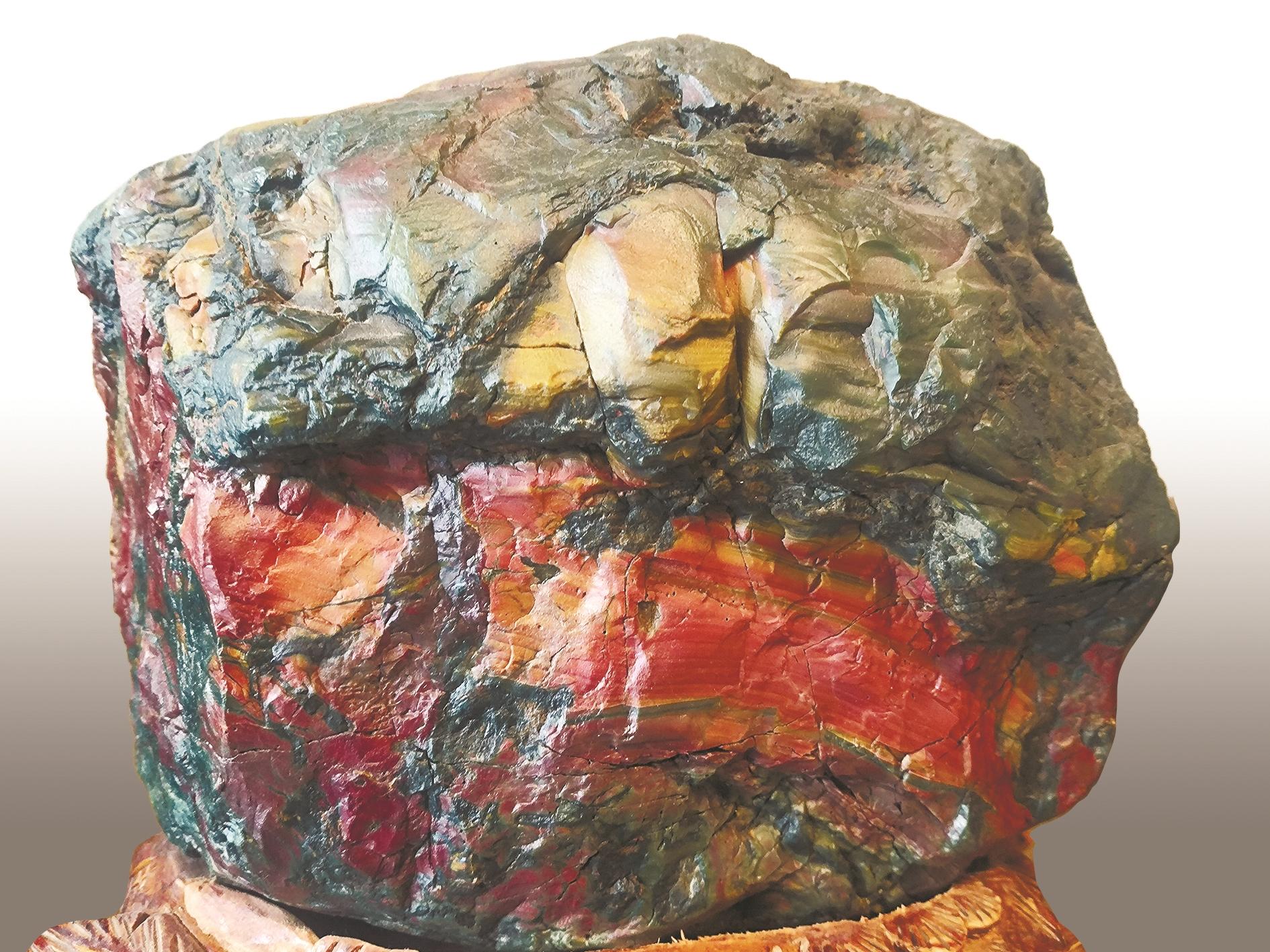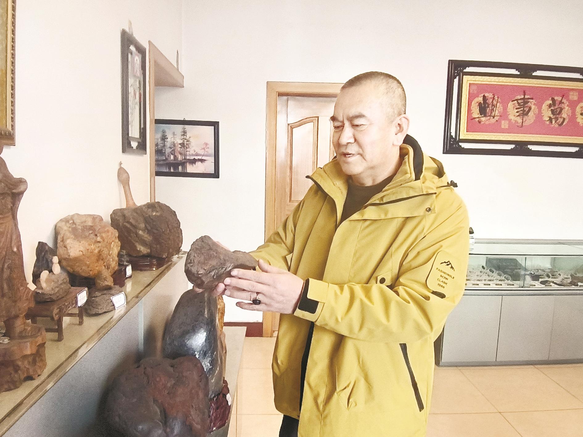葛钧耀与奇石结缘始于偶然。1988年,朋友邀请他到巴彦淖尔盟乌拉特后旗玛瑙湖游玩。“我在玛瑙湖第一次看到玛瑙、沙漠漆、老皮等石种,当时也不懂,就是听朋友说。那时还能看到水晶,在太阳下亮晶晶的。看到这么多奇石,我感受到了大自然的神奇。”他说。这次玛瑙湖之行后,他开始学习奇石知识,通过与朋友聊天,逛奇石展会,见到了全国各地不同种类的奇石。