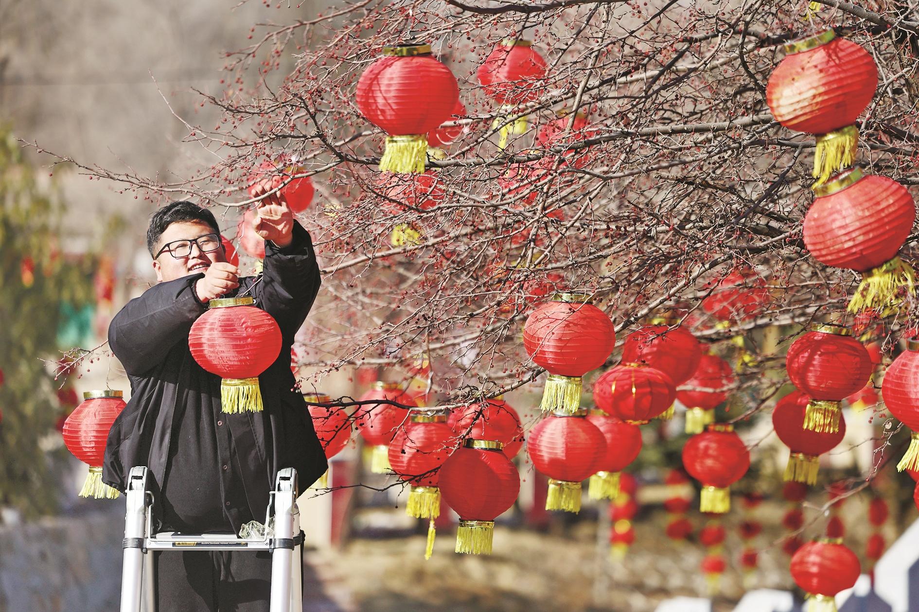 元古堆村村民徐永红将红灯笼挂在树上(1月14日摄)。