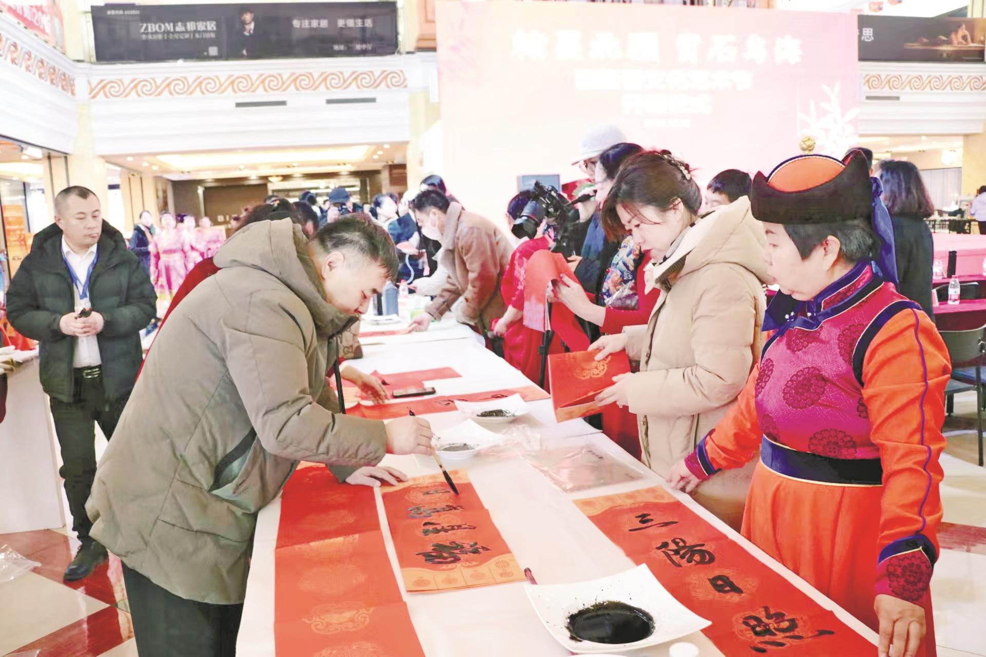 近日,海勃湾区举办“翰墨北疆 赏石乌海”迎新春文化艺术节,活动现场共展出60余幅书画及摄影作品,并邀请多位书法家现场挥毫泼墨,为市民书写对联并送上新春祝福。此次艺术节将持续至1月22日。图为书法家现场书写春联。(王玥 摄)
