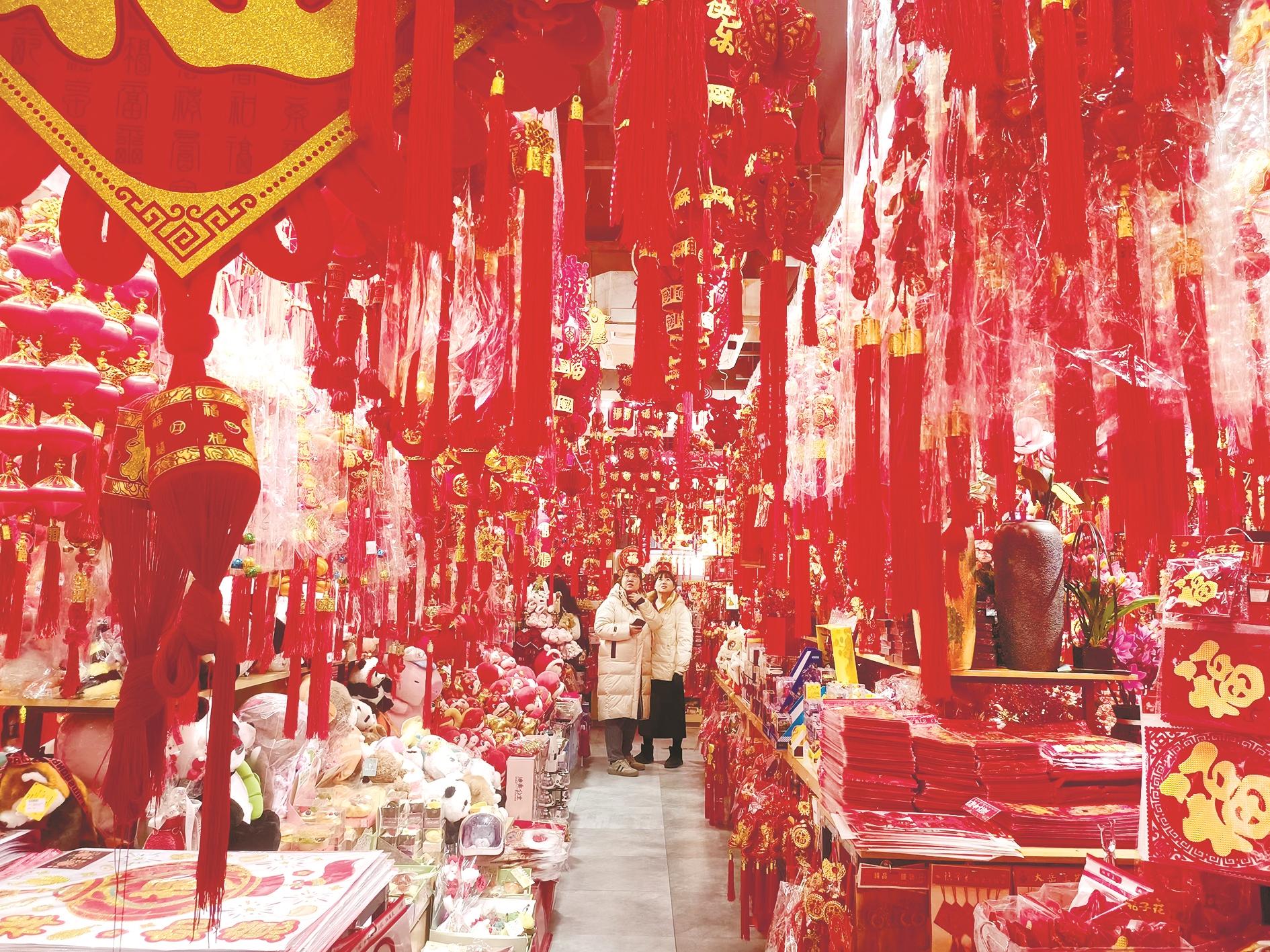“今年是蛇年,对联、挂件、红包上的蛇惟妙惟肖,有的设计得特别好看,家里小朋友很喜欢……”正在选购新年装饰品的张女士表示,春节就是咱中国人一年中最大的节日,每年都要采购一些新年装饰品,让家里多一些年味。