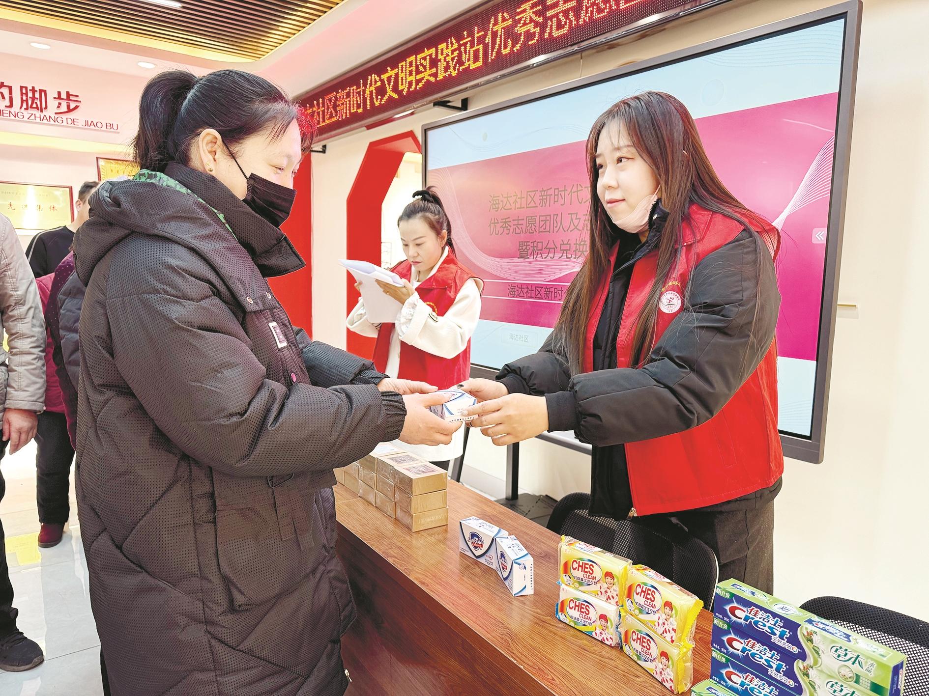 近日,海勃湾区新华西街道海达社区新时代文明实践站开展文明实践积分兑换活动,进一步激发社区居民参与志愿服务的热情,营造“人人争当志愿者,处处可见志愿红”的良好氛围。 (段维娜 摄)