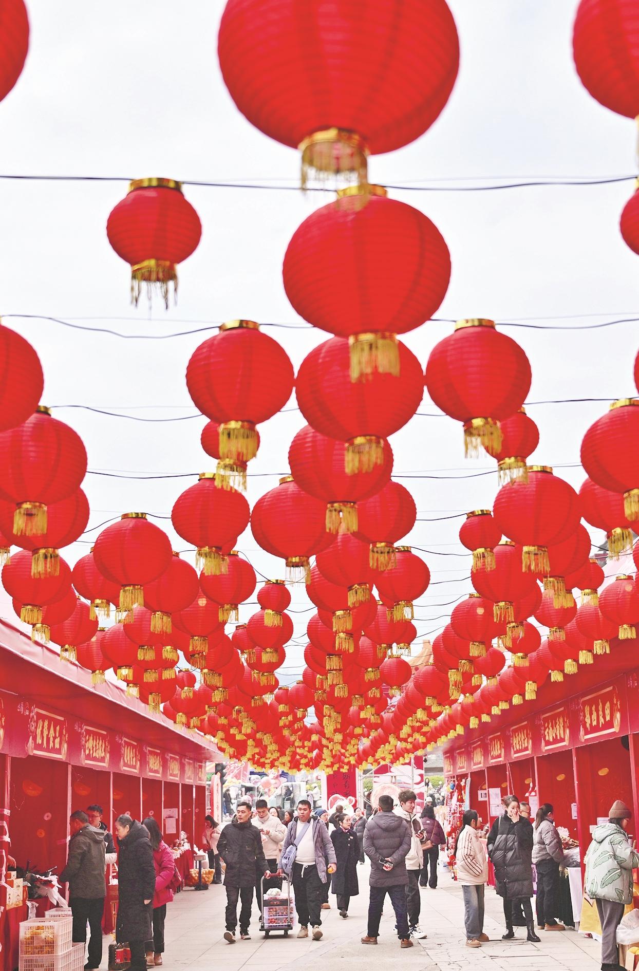 一月十七日,市民在湖北省宣恩县城红灯高挂的年货市场选购年货。春节将至,全国各地年味渐浓,人们逛集市、购年货,参加各种迎新年活动。 新华社发(宋文 摄)