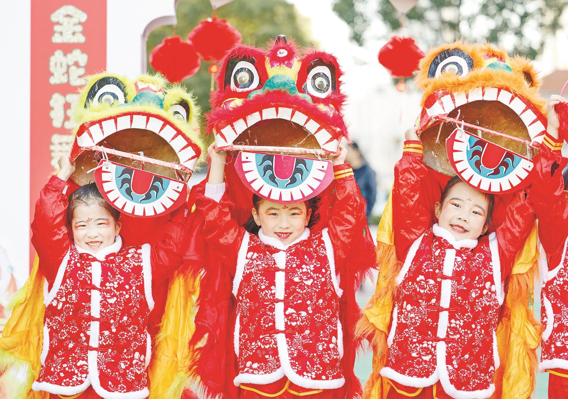 1月17日,在安徽省黄山市屯溪示范幼儿园,小朋友在体验民俗舞狮。 新华社发(施亚磊 摄)