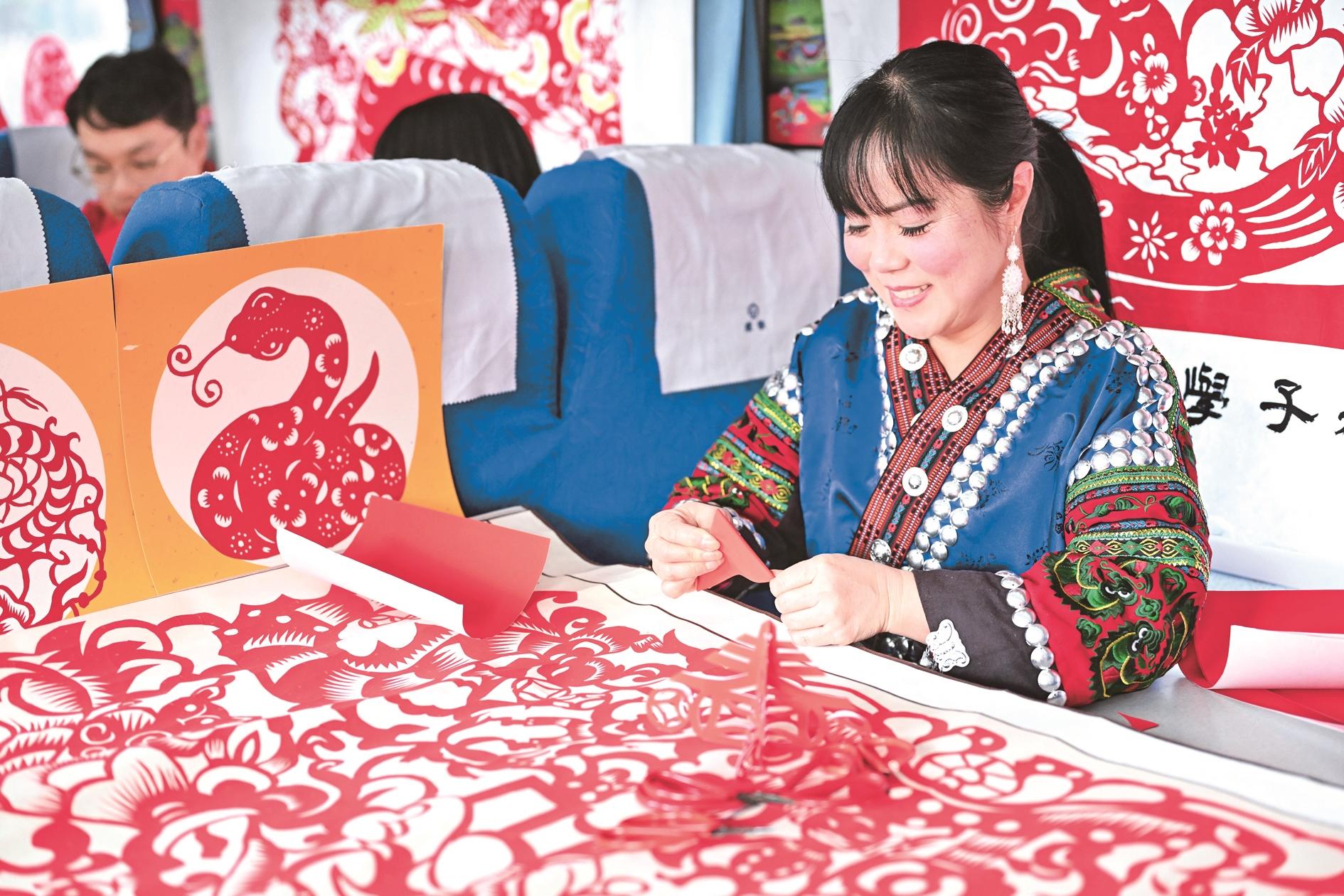 1月18日,非遗传承人在5640次列车上向乘客展示剪纸技艺。