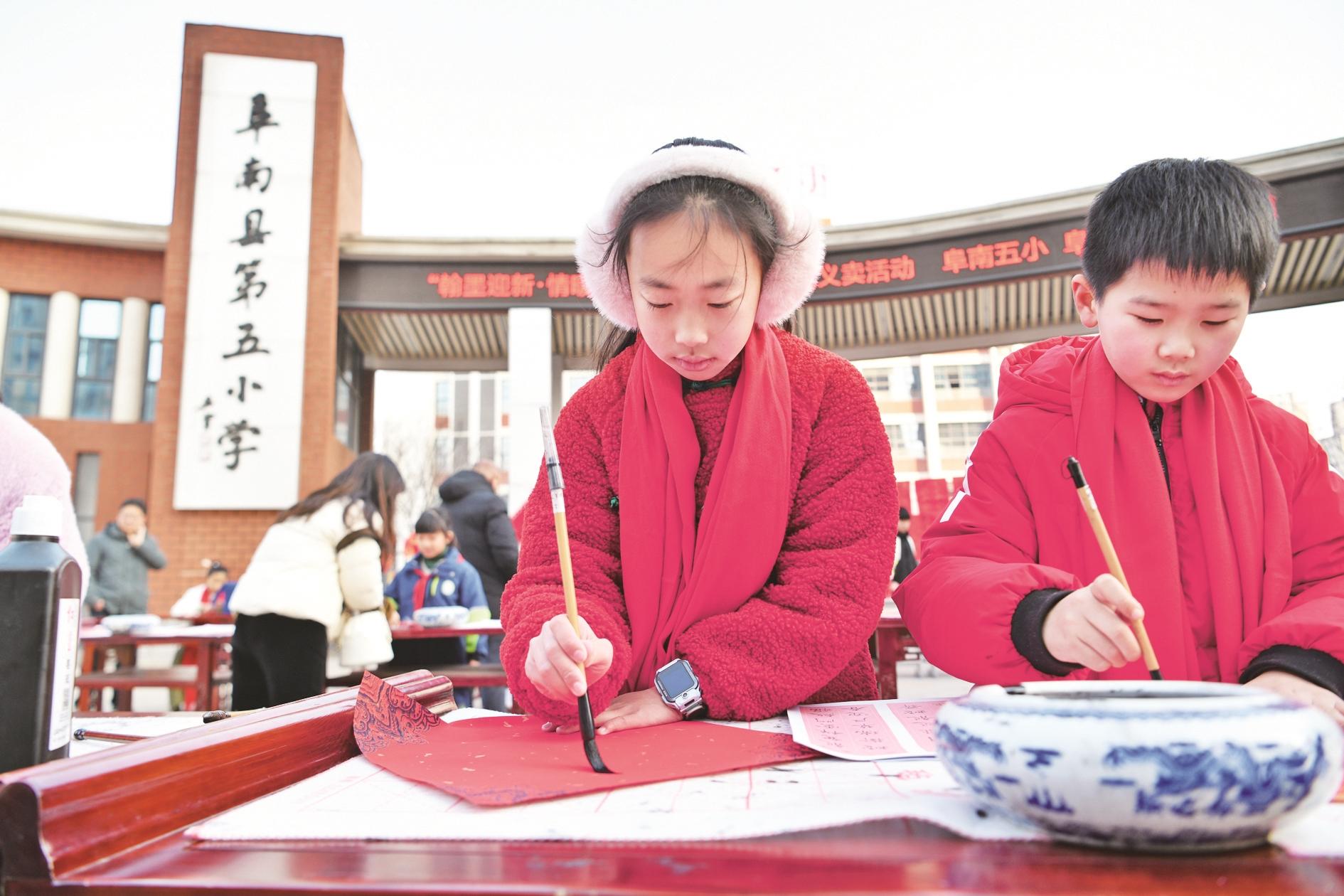 1月21日,安徽省阜阳市阜南县第五小学的学生在书写春联。新春临近,各地举行写春联、写福字活动,书法爱好者挥毫泼墨为广大市民送去祝福。