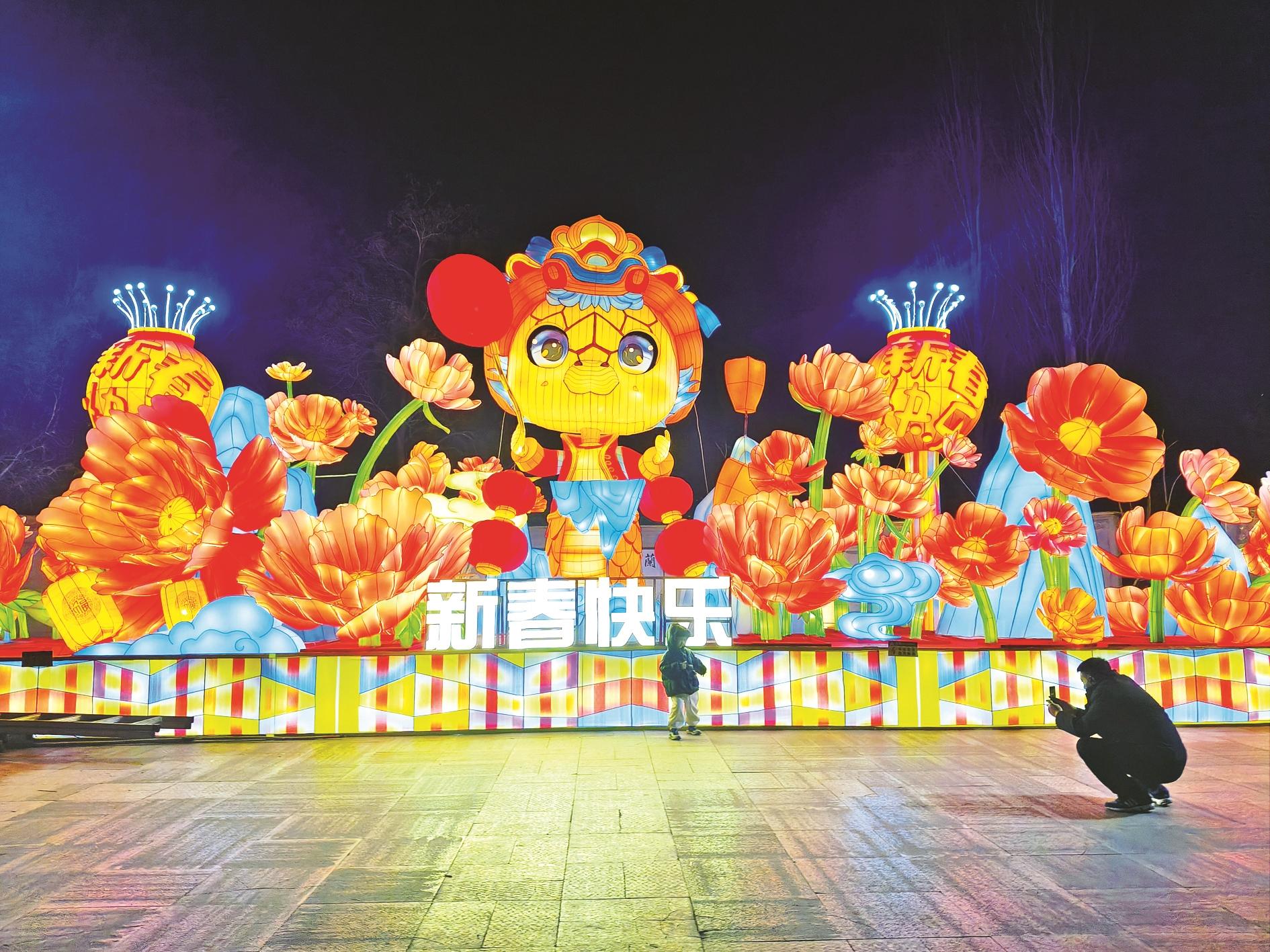 市民在市人民公园花灯前拍照打卡。(段维娜 摄)
